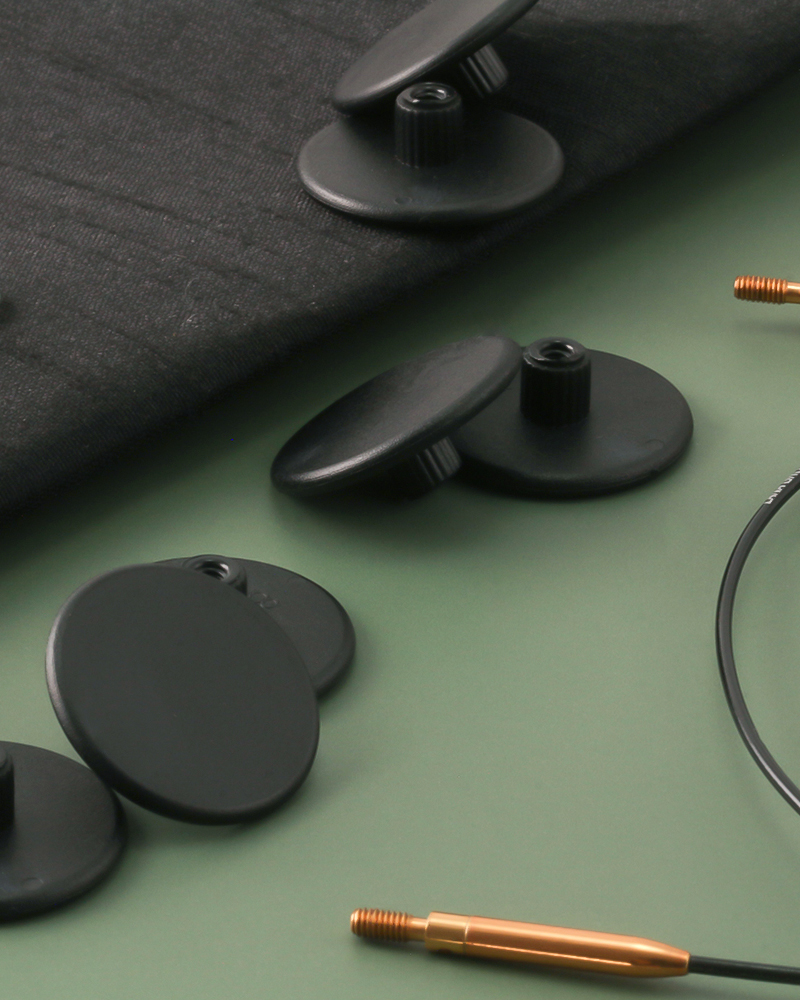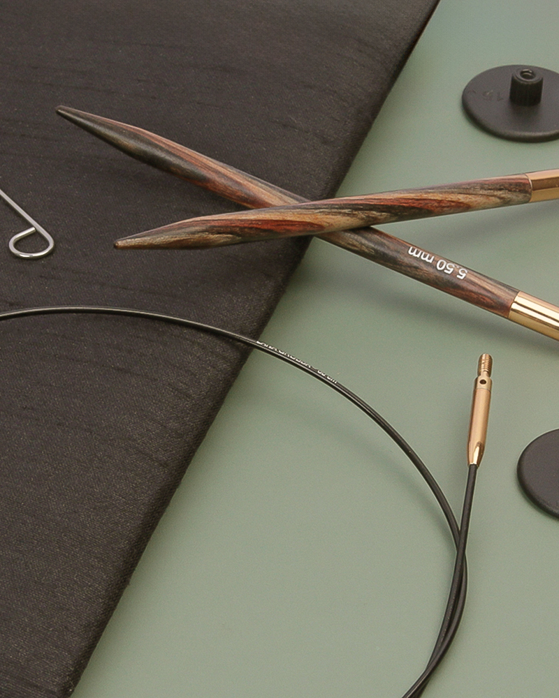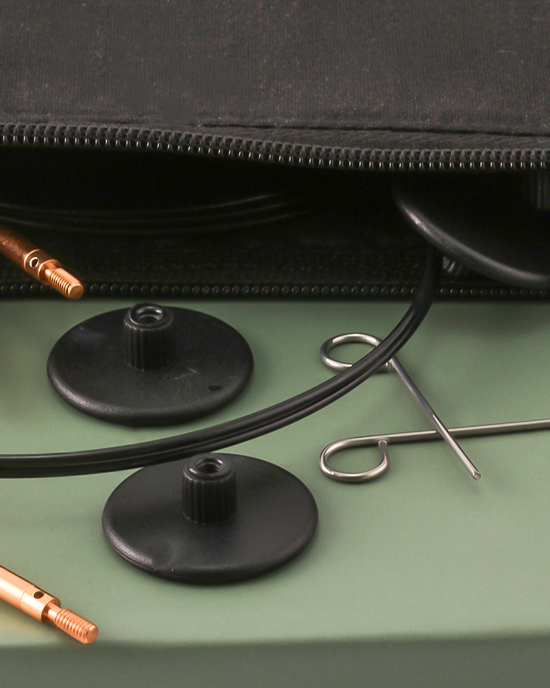 8 utskiftbare rundpinner (Design-tre i naturoptik) med følgende tykkelse: 3,5 / 4,0 / 4,5 / 5,0 / 5,5 / 6,0 / 7,0 / 8,0 mm 4 vaiere med vaierskjøter før følgende lengder: 60 / 80 / 100 / 120 cm 8 stoppere og 4 vaiernøkler