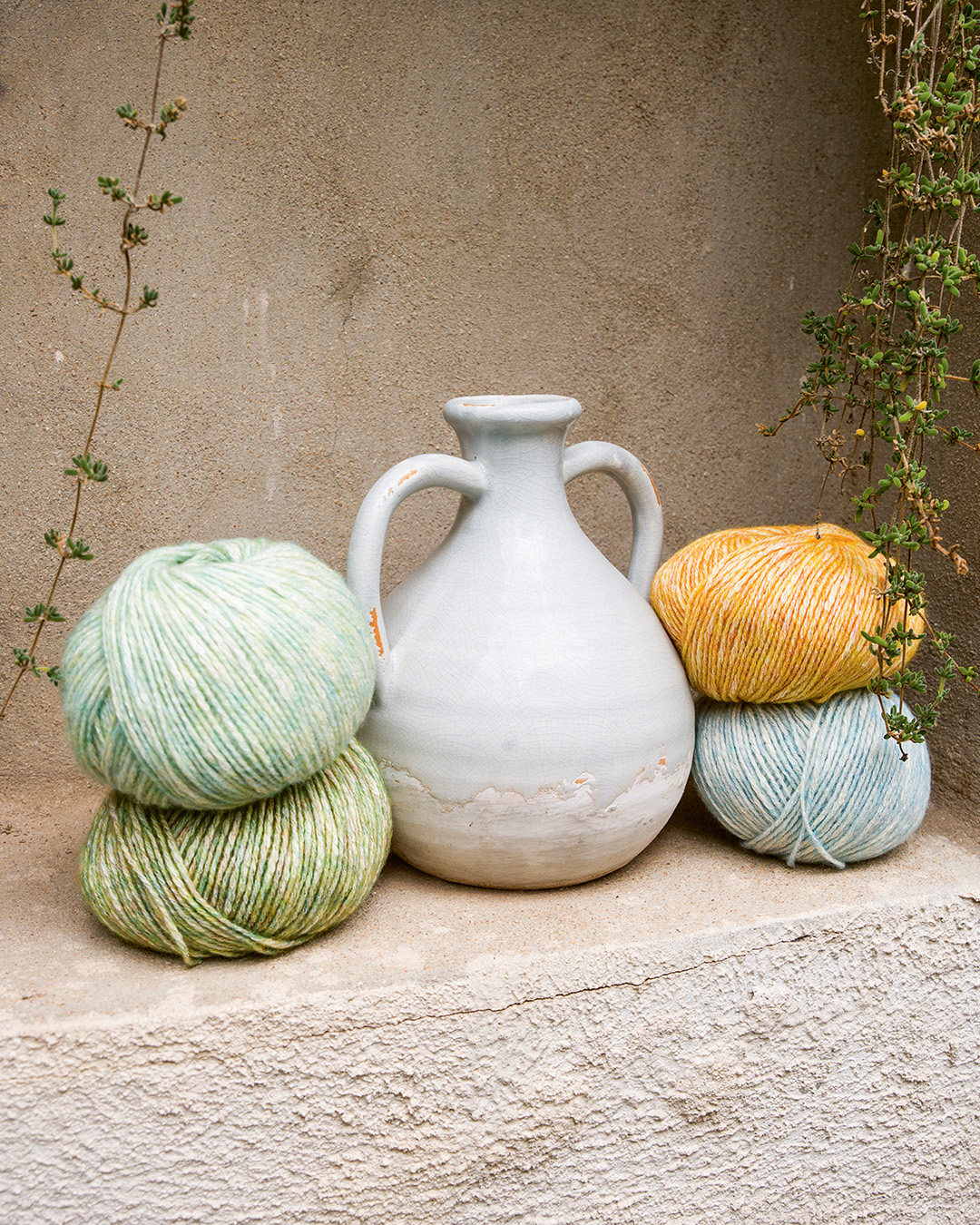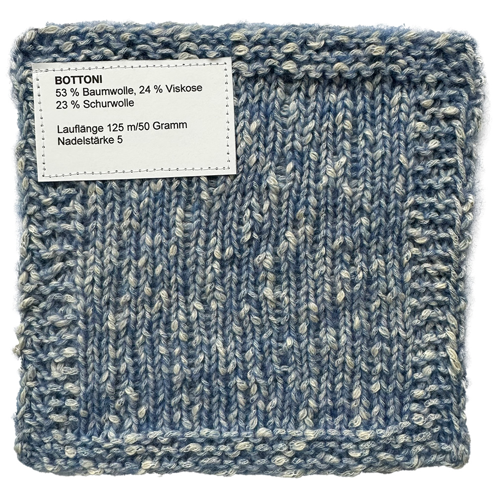 Bottoni har en spesiell karakter: På innsiden kombinerer det en myk blanding av bomull og viskose, som er omsluttet av et fint lag med delikate merinofibre. Innvevde knopper skaper lekne detaljer og gir garnet sitt unike, livlige uttrykk.