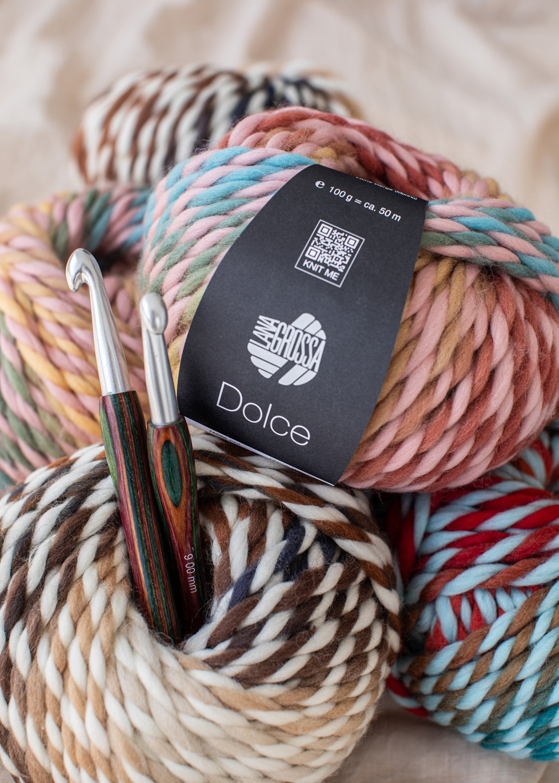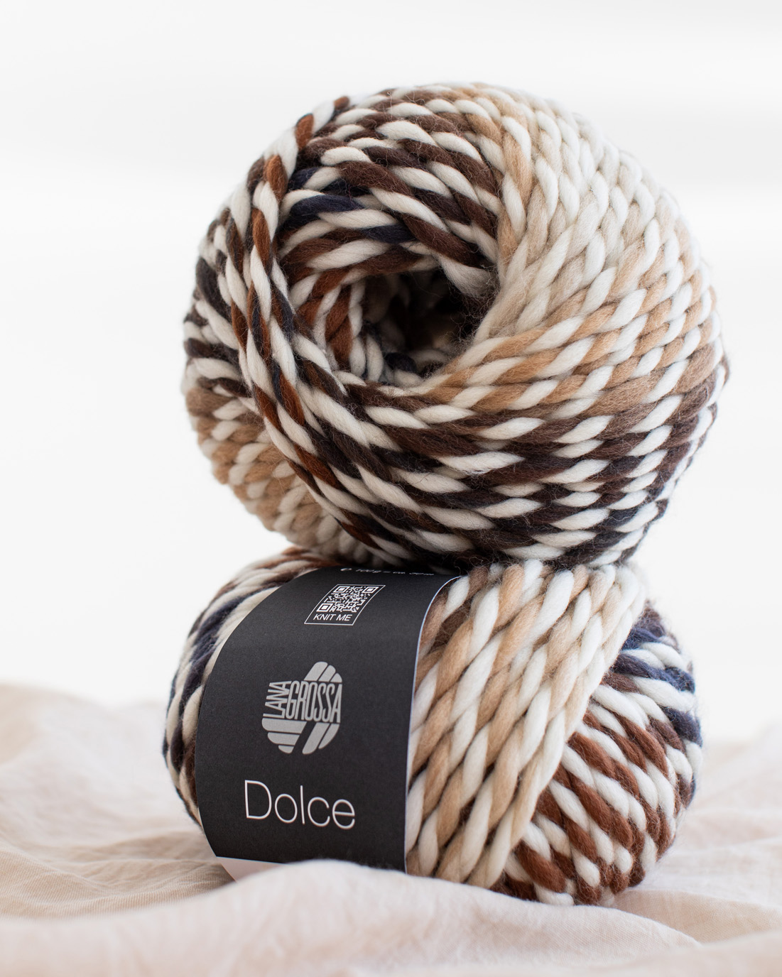 Med sin ekstra tykke struktur kan moderne gensere, jakker og tilbehør strikkes på kort tid. Det unike utseendet med markante striper og mouliné-effekter gir hvert prosjekt karakter. Et must for alle som elsker voluminøse vintergarn. Lana Grossa Dolce passer spesielt godt for nybegynnere.