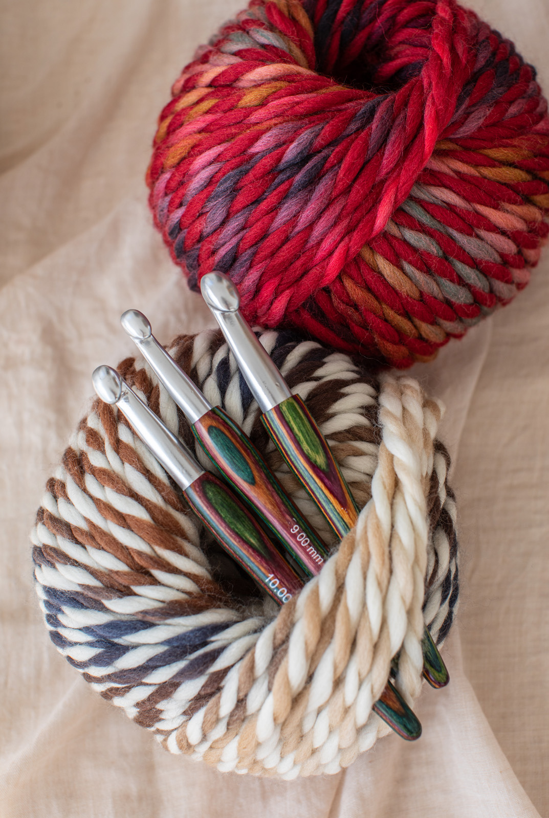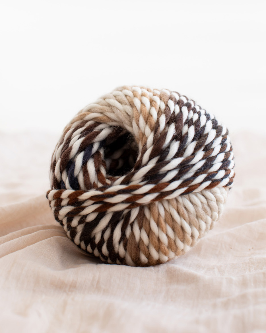 Perfekt for chunky knits: Vårt tommeltykke dochtgarn, et garn med en tykk kjerne som gir volum og struktur, skaper brede striper og mouliné-effekter.