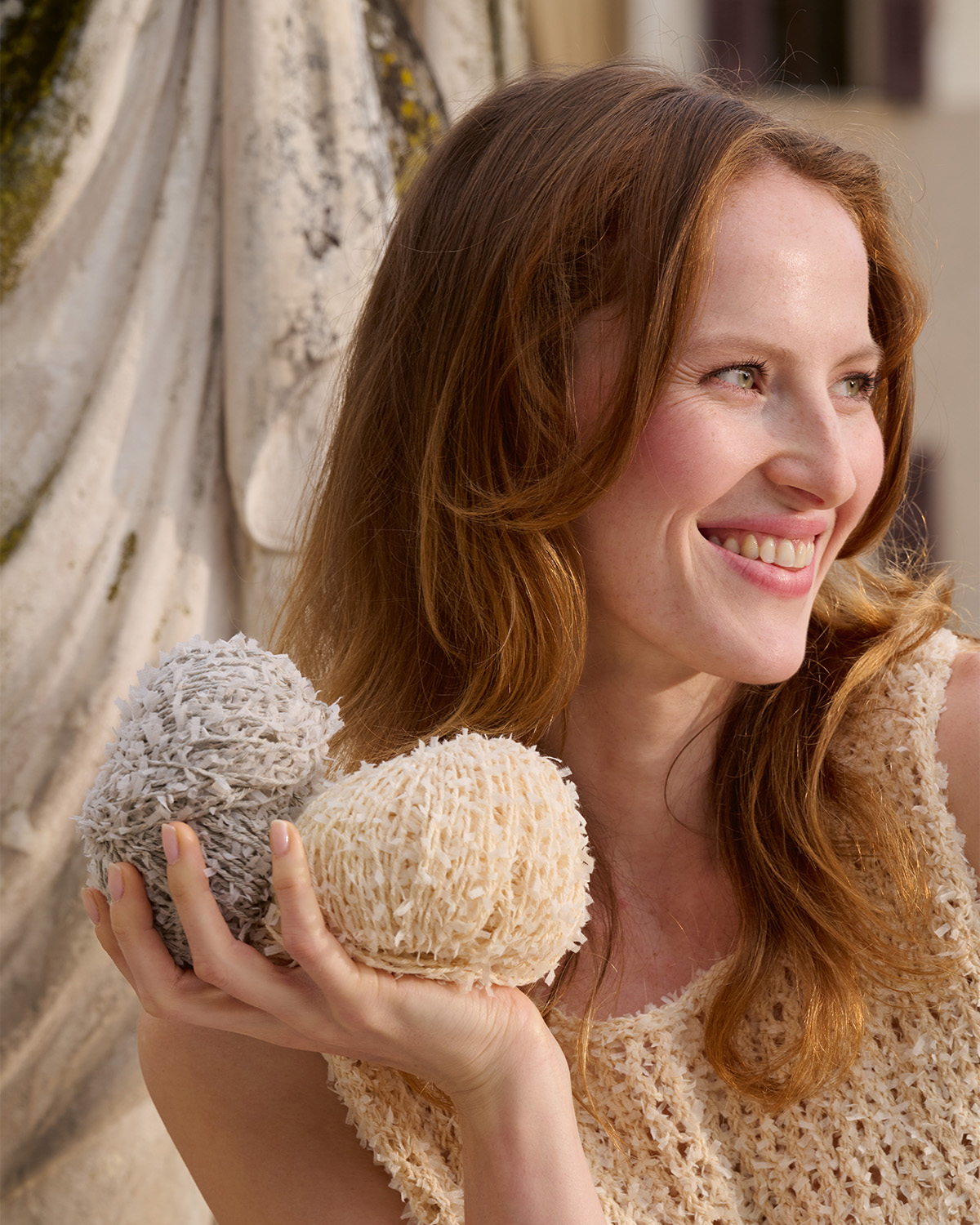 Effektgarn av bomullstråder med innvevde papirstrimler Garnet skaper fargerike og lekne design med sin myke følelse og livlige uttrykk. Kombinasjonen gir en overraskende myk tekstur og en uttrykksfull, dynamisk overflate. Perfekt til utradisjonelle design, kreative detaljer og for alle som elsker det spesielle – moderne, lett og helt i trend.