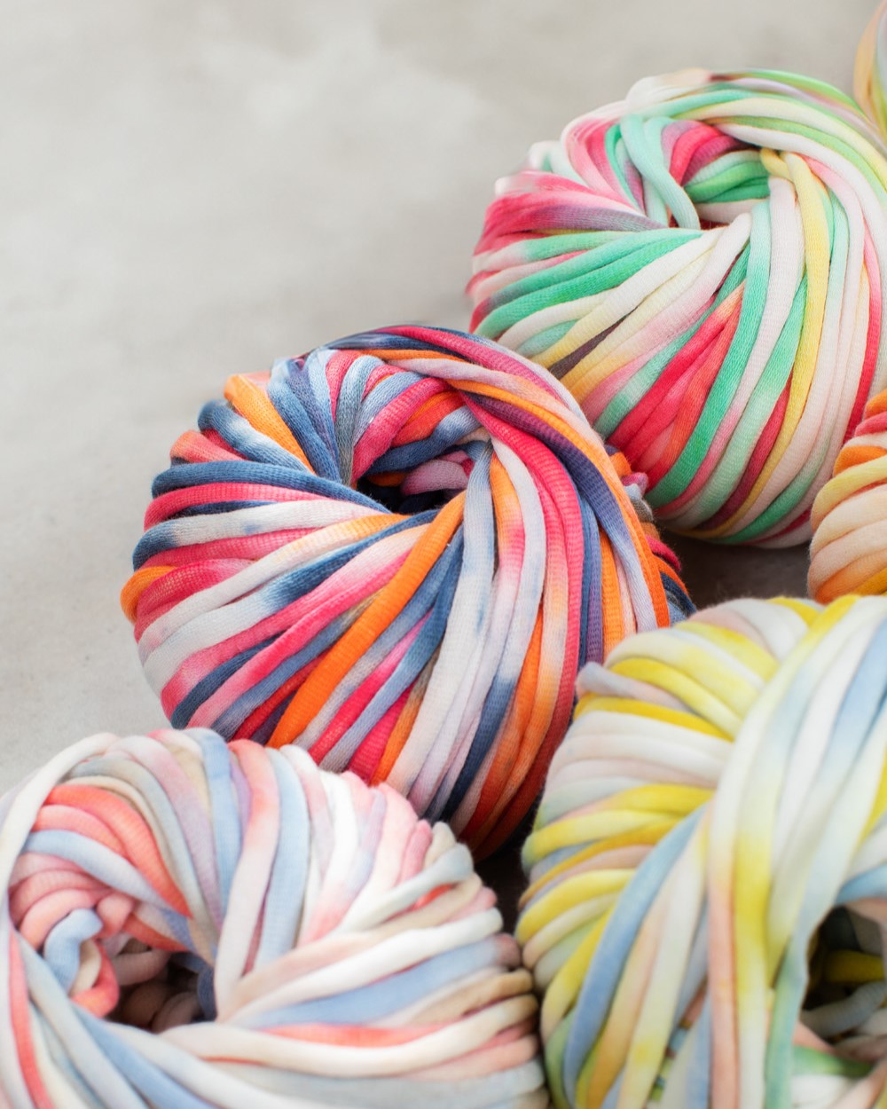 Mykt, fylt, rørformet bomullsgarn med fargerikt spettet trykk