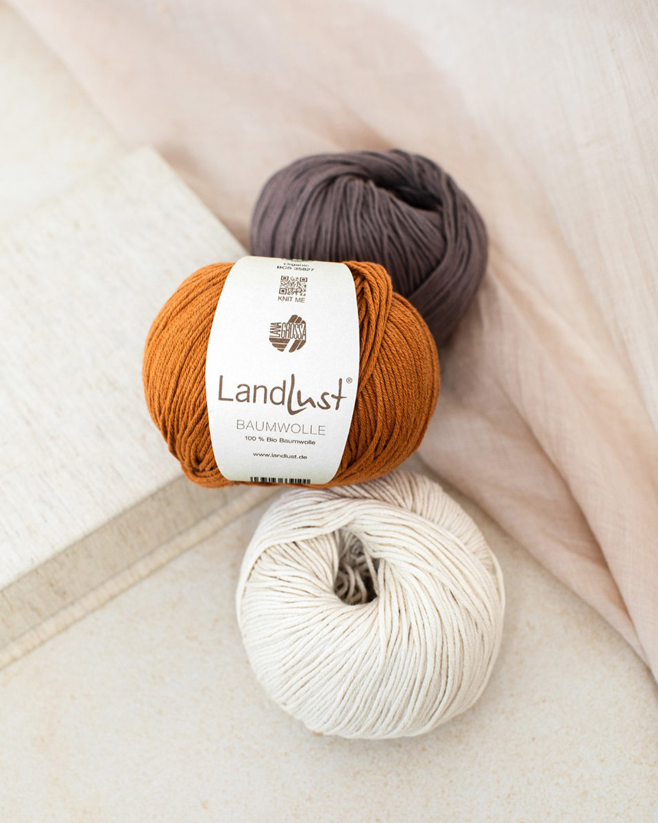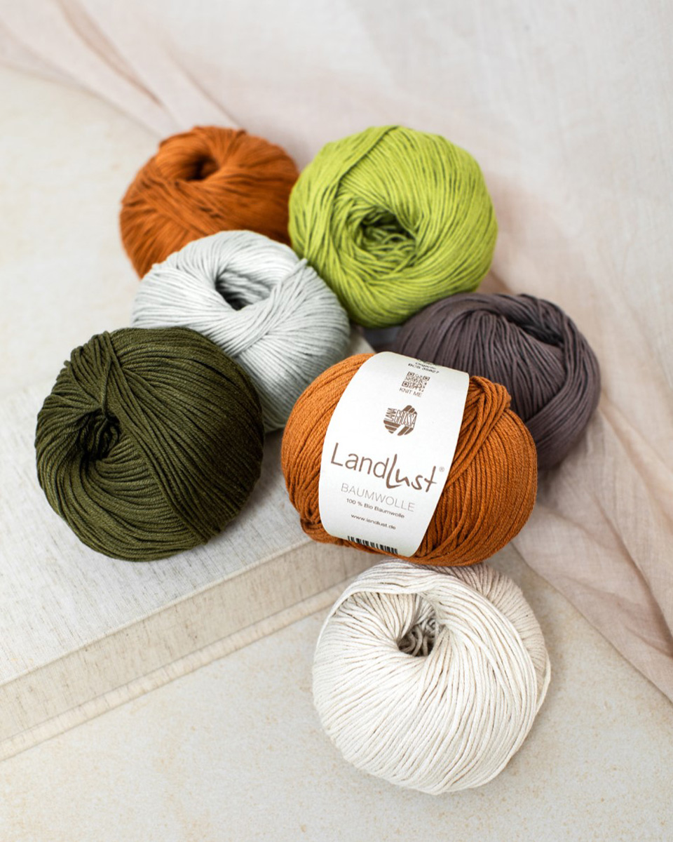 Landlust Bomull er et naturlig, mykt garn av 100 % økologisk bomull, utviklet i samarbeid med magasinet Landlust. Det har et behagelig og lett gripbart maskebilde. Takket være den hudvennlige, GOTS-sertifiserte økologiske kvaliteten er det også ideelt for sensitiv hud.