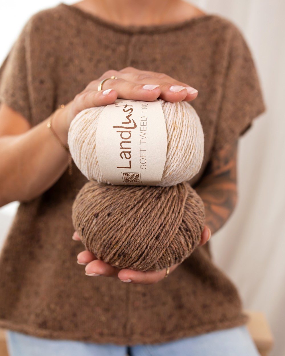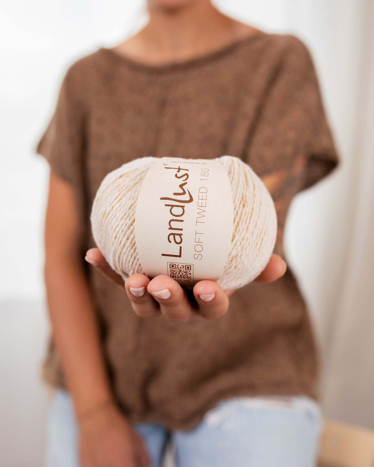 Landlust Soft Tweed 180 er et herlig mykt tweedgarn med rustikk sjarm og moderne preg. I samarbeid mellom Lana Grossa og magasinet Landlust imponerer det med en høykvalitets blanding av 100 % merinoull, som føles behagelig mot huden og samtidig gir et naturlig utseende. Garnet er lett, voluminøst og pustende – ideelt for myke gensere, jakker og tilbehør med et snev av landlig stil. Små tweednupper gir liv og struktur til strikkebildet.