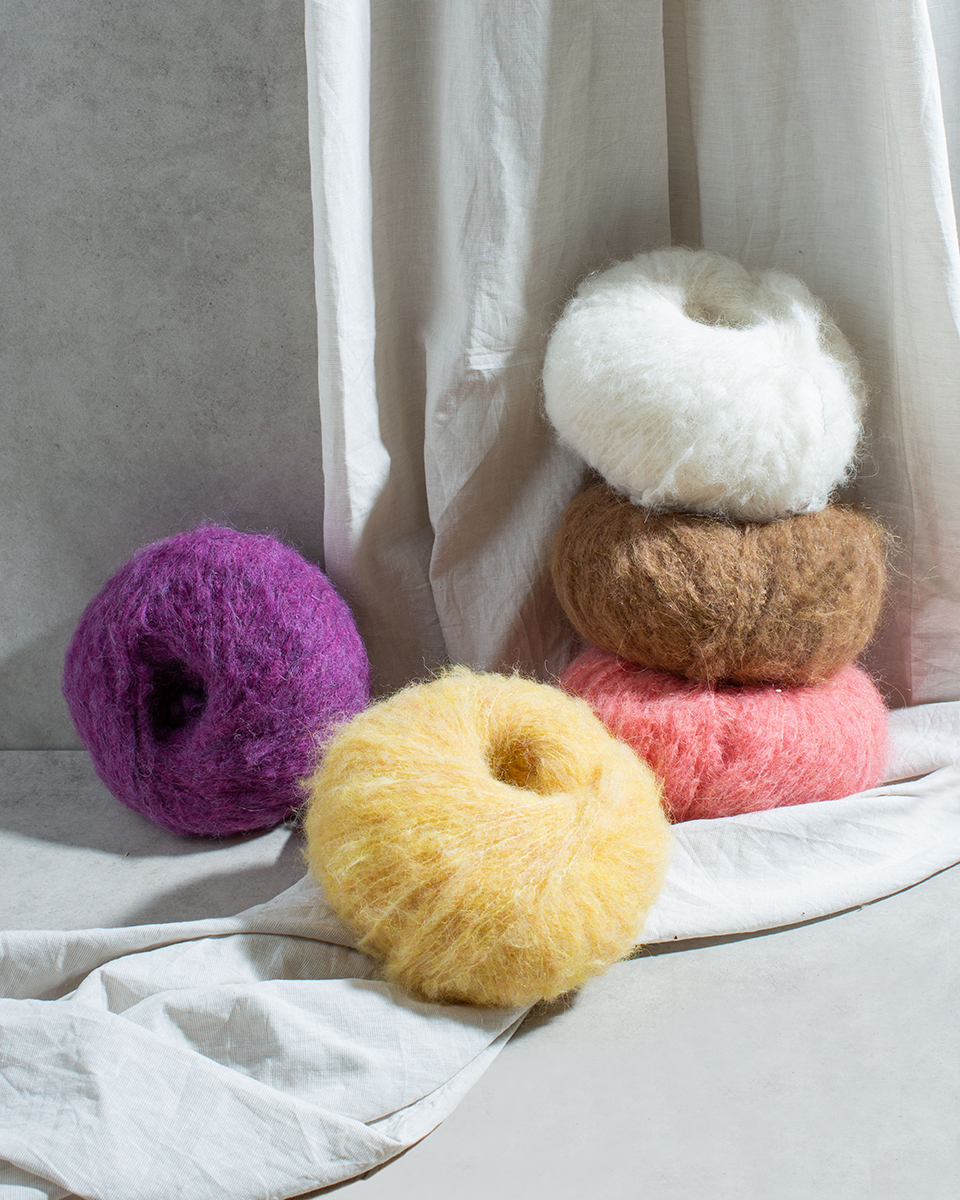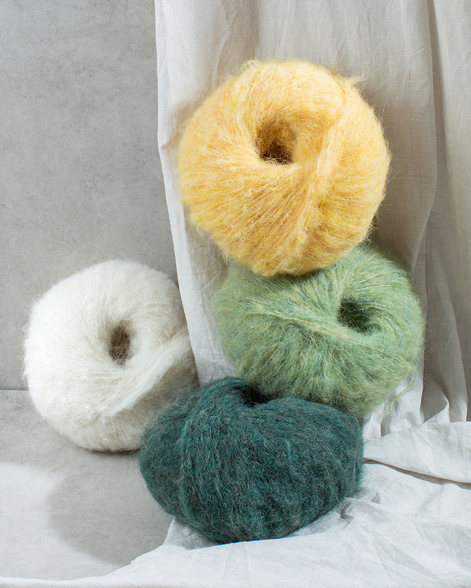 60 % Mohair, 30 % Silke, 7 % Bomull, 3 % Polyester