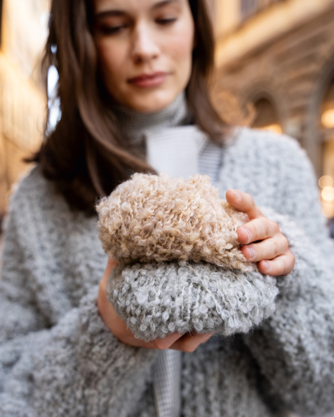 Mykt bouclégarn spunnet av en blanding av alpakka og merinoull.