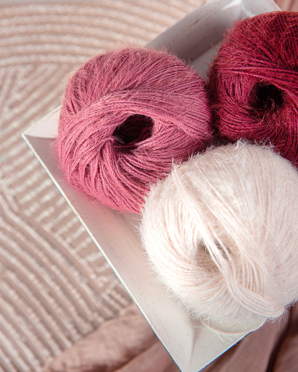 60 % Mohair, 30 % Silke, 7 % Bomull, 3 % Polyester
