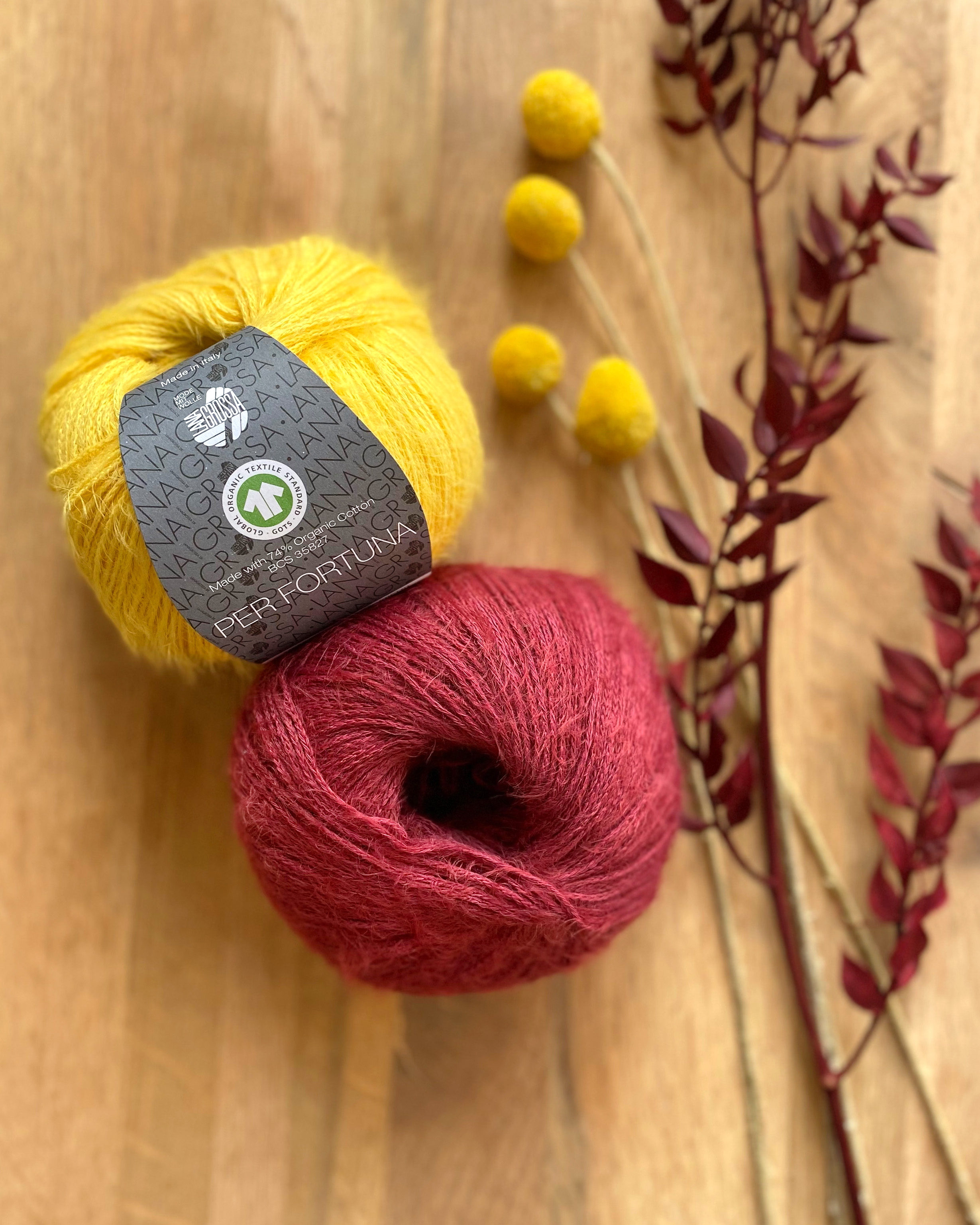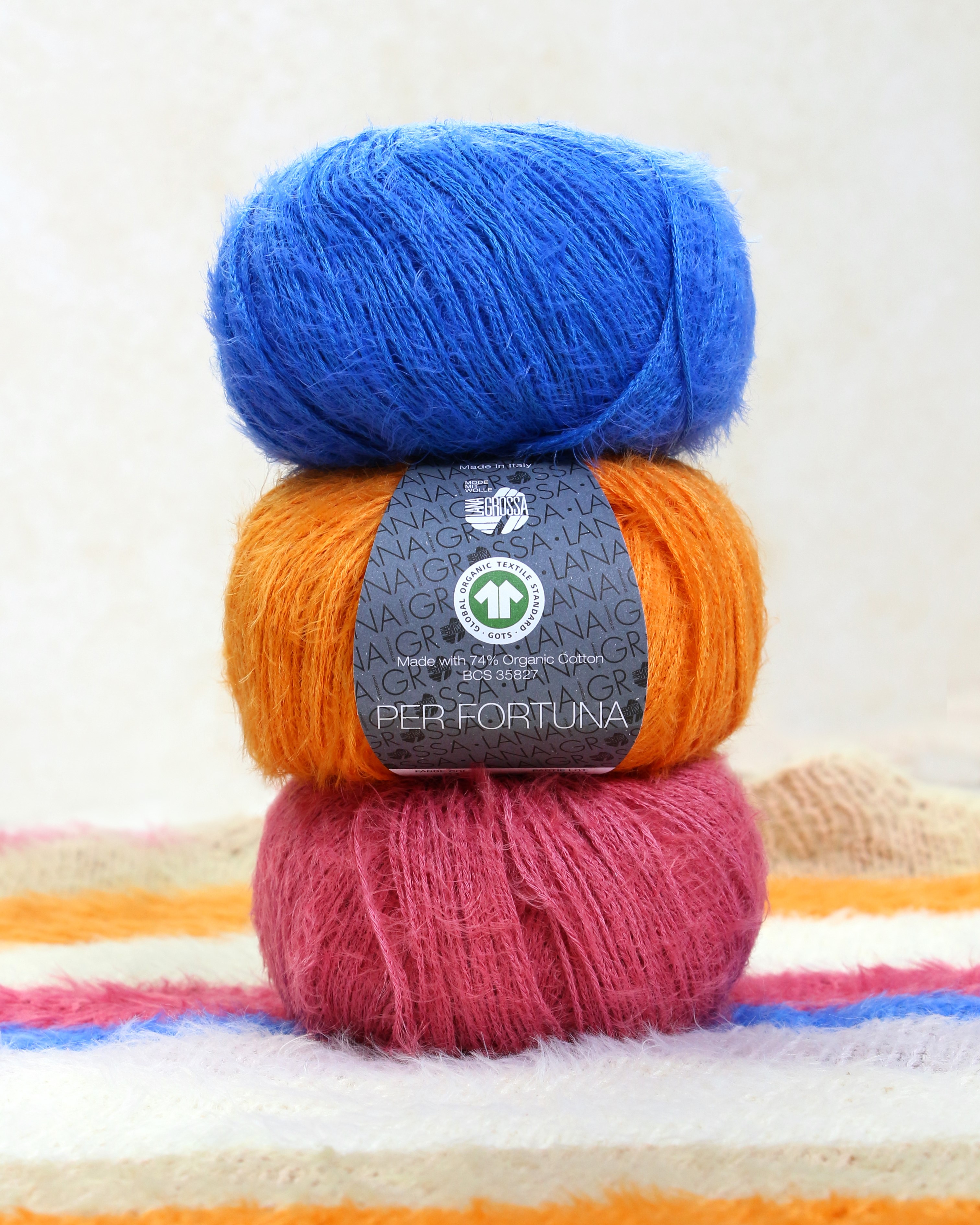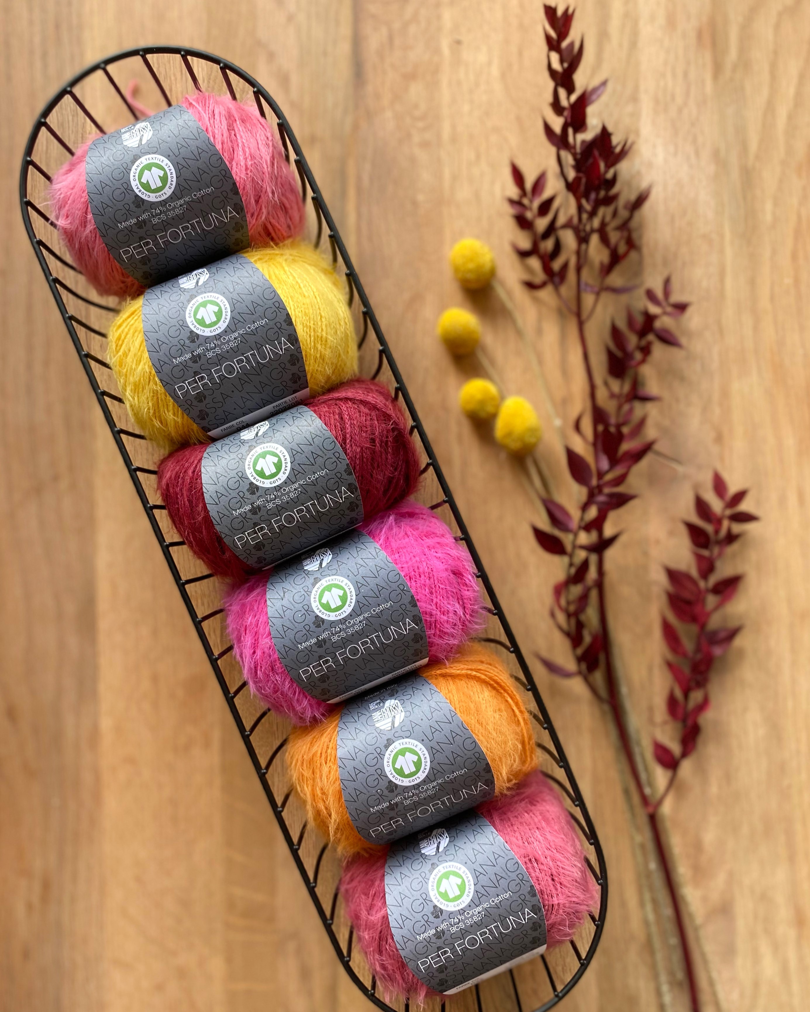 Per Fortuna er et bærekraftig kjedegarn med koselig mykhet og en spesielt behagelig følelse. Det er laget av økologisk bomull og resirkulert polyamid og er GOTS-sertifisert – ideelt for alle som ønsker å strikke miljøbevisst uten å gå på kompromiss med komfort.