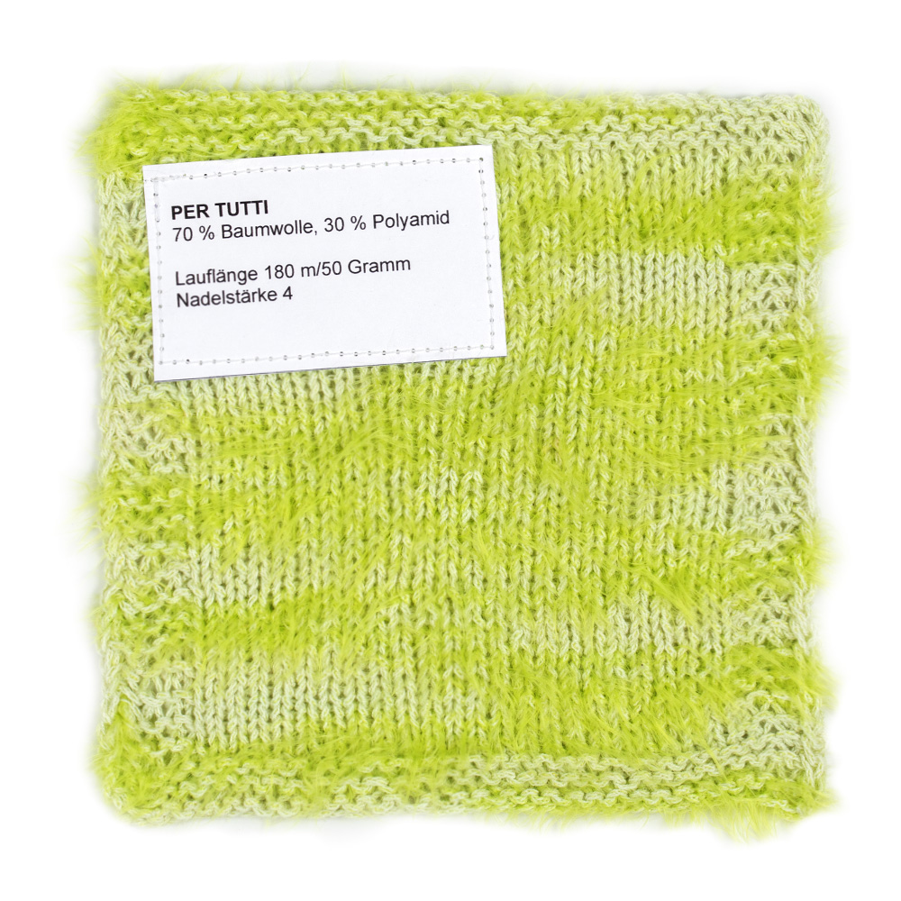 Per Tutti er et lett bomullsgarn med spennende struktur og moderne karakter. Glatte, diskret skinnende partier veksler med myke, lodne partier – dette gir et levende maskebilde og en spesielt behagelig følelse.
