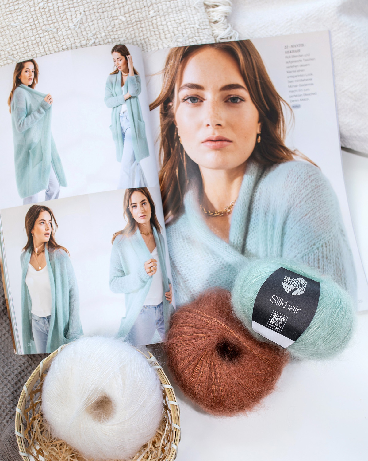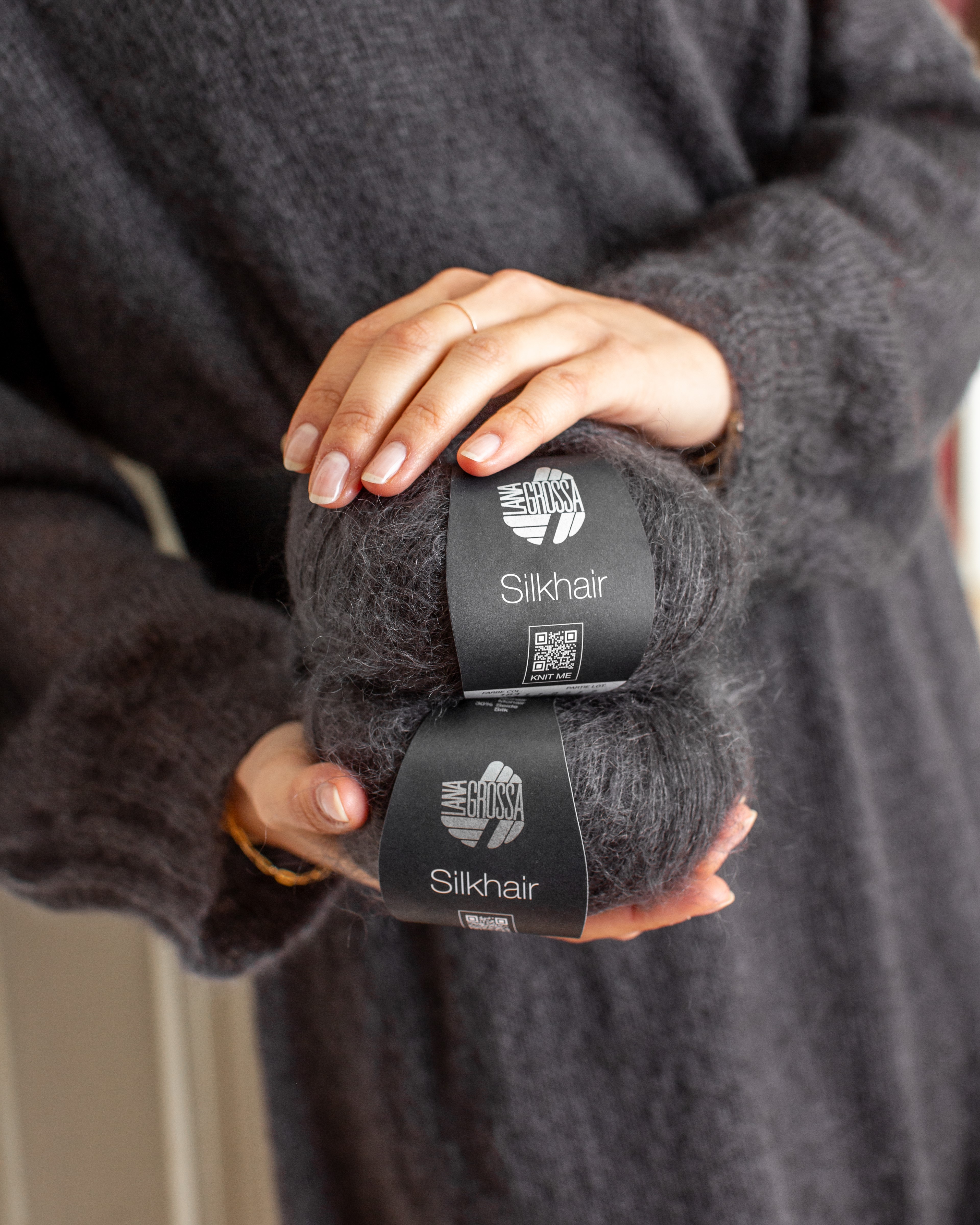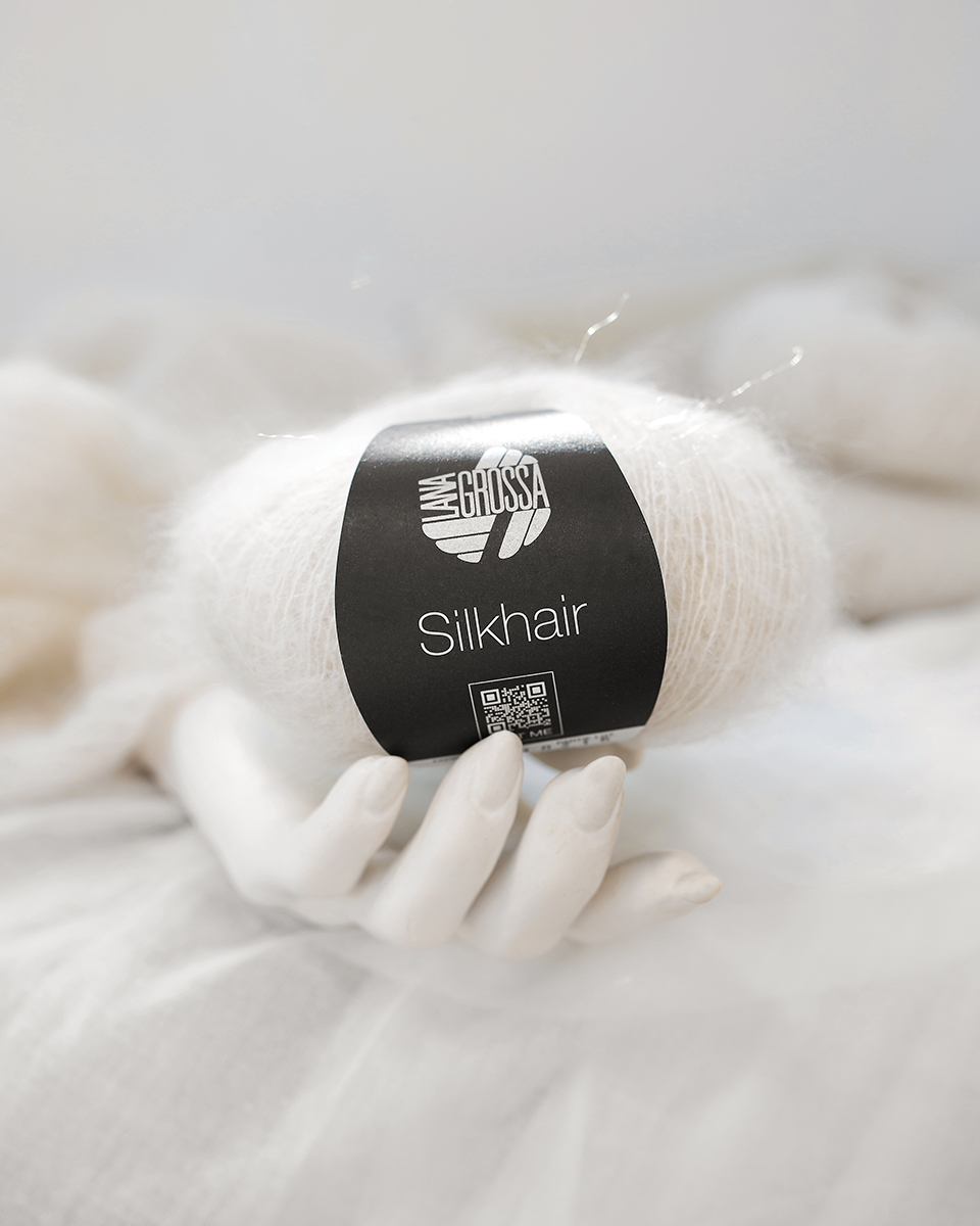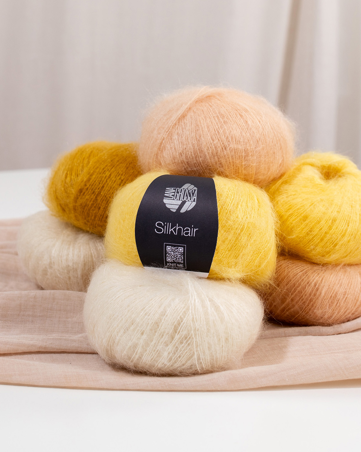 Silkhair er det populære lacegarnet fra Lana Grossa – en luksuriøs blanding av superkid-mohair og silke som imponerer med sin letthet, subtile glans og elegante mykhet. Ideelt for lette sjal, gensere, luftige cardigans eller som medløpsgarn for elegante effekter. Enten det strikkes alene for et transparent og luftig resultat, eller dobbelt for mer volum – Silkhair gir hvert strikkeplagg et eksklusivt og feminint preg.