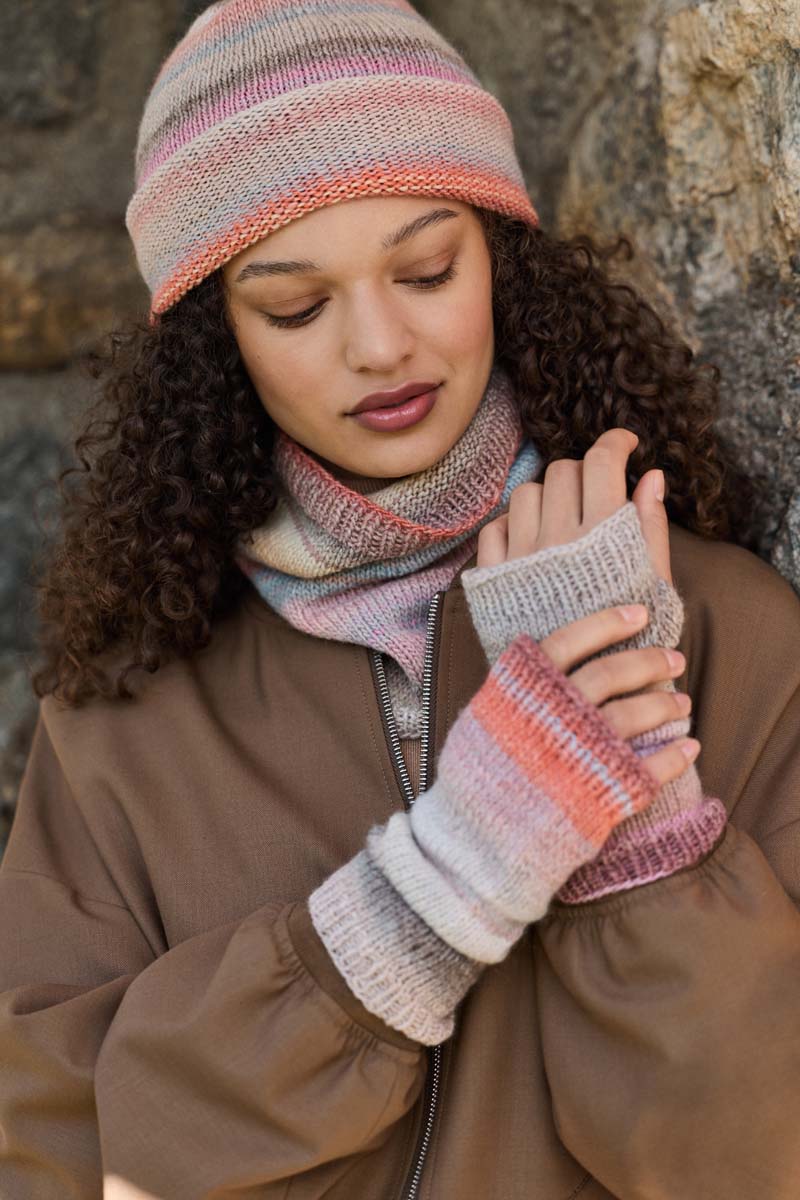 Lana Grossa-kvalitet „Gomitolo Intenso“ (50 % ren ny ull, 50 % polyacryl, løpelengde = ca 700 m/200 g): 1 nøster = ca 200 g lysgrå/aprikos/bleikgul/mykblå/mykrosa/grå/grège/fersken (farge 236); 1 kort rundpinne oder settpinner nr. 4.