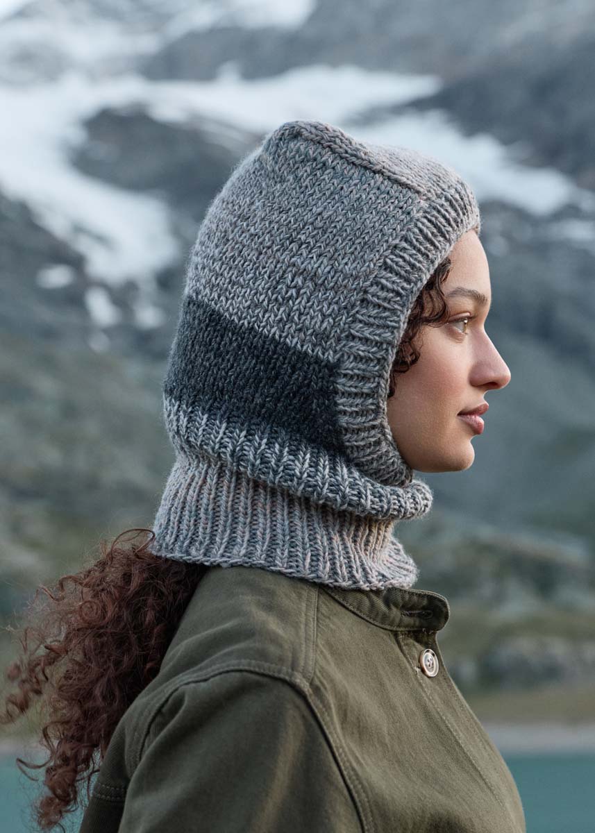 Lana Grossa-kvalitet „Gomitolo Fumo“ (50 % ren ny ull, 50 % polyacryl, løpelengde = ca 700 m/200 g): 1 nøster = ca 200 g mykgrå/lysegrå/mellomgrå/mørkgrå/grège/anthrasitt (farge 518); 1 kort rundpinne oder settpinner nr. 5.