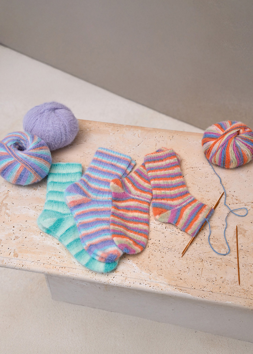 Variant A: Lana Grossa Cosy Socks Soft Stripes (70% ren ny ull (merino), 30% polyamid, LL = ca. 400 m/100 g): 100 g jade/ lysende grønn/hvitgrønn/natur (frg 102); Strømpepinner nr. 2,5.