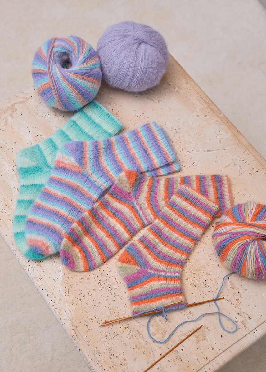 Variant B: Lana Grossa Cosy Socks Multi Stripes (70% ren ny ull (merino), 30% polyamid, LL = ca. 400 m/100 g): 100 g lavendel/gråblå/laks/krem/turkis (frg 153); Strømpepinner nr. 2,5.