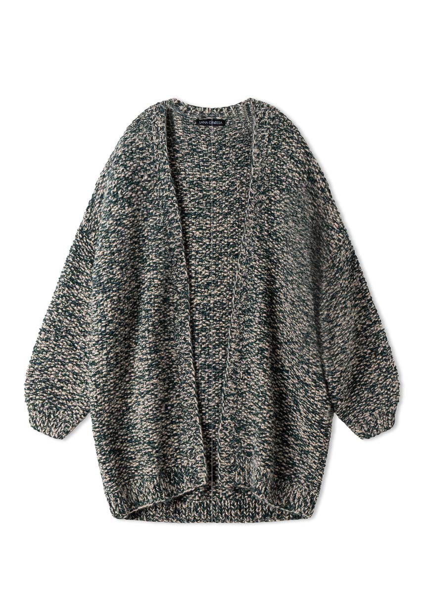 Lana Grossa Brigitte No. 2 (47% alpakka (baby), 45% bomull, 8% ny ull (merino), løpelengde 140 m/50 g), 450 (500 - 550 - 600) g hver i lys beige (farge 47) og i svartgrønn (farge 73); strikkepinner nr. 5 og nr. 6; 1 rundpinne nr. 5; 120 cm lang.