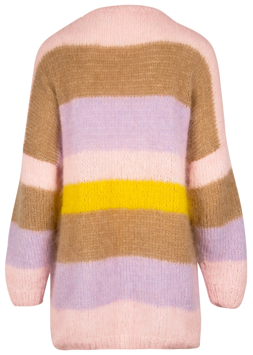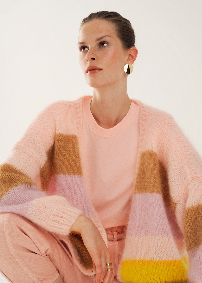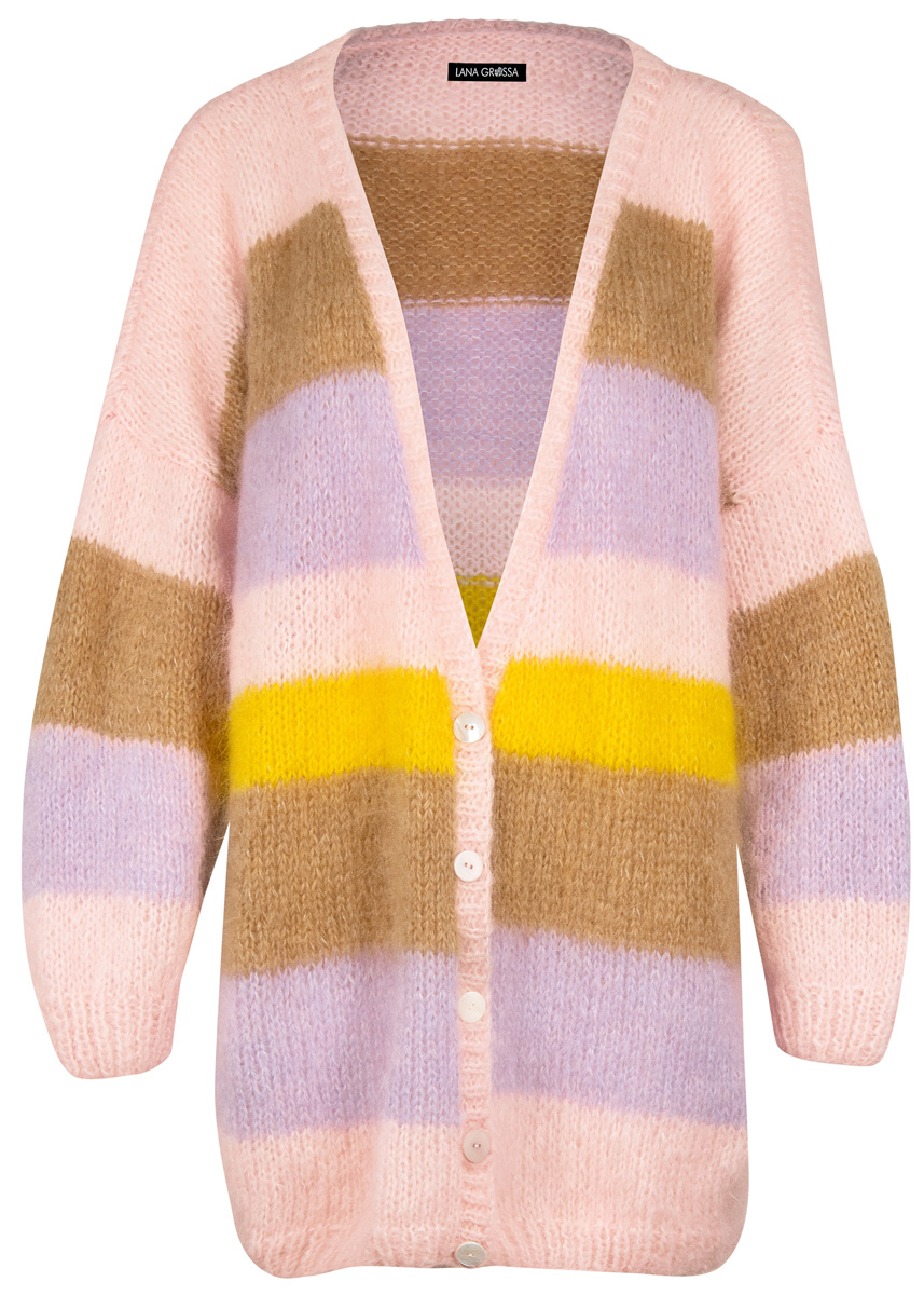 Lana Grossa-kvalitet ”Brigitte No. 3” (40 % mohair, 37 % ren ny uld, 23 % polyamid, løbelængde = ca. 100 m / 25 gr.): ca. 175(200) gr lys rosa (fv 8), 125(150) gr camel (fv 19), 125(150) gr syrenrosa (fv 7) samt 25(50) gr gul (fv 1), strikkepinde nr. 5 og 6, rundpind nr. 5, 80 cm, 5 perlemorsknapper 20 mm Ø.