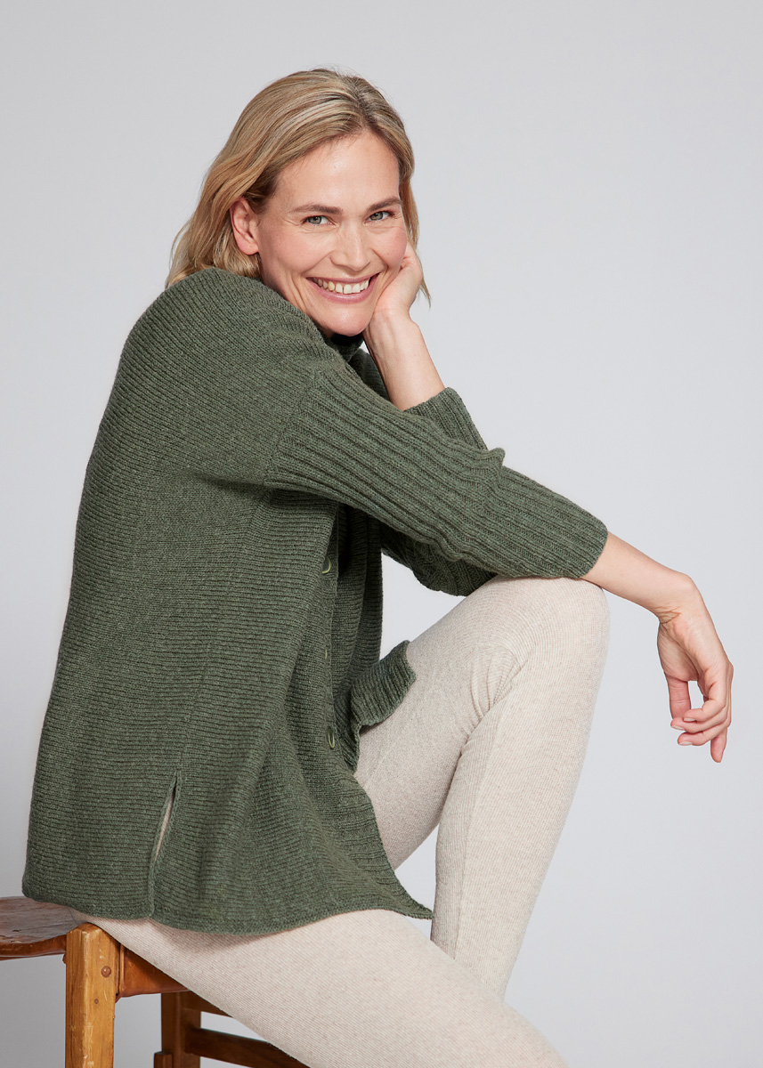 Lana Grossa Cashmere 16 Fine (80% ren ny ull, 10% kasjmir, 10% polyamid, løpelengde 320 m/50 g), 350 (400 – 450) g grågrønn (farge 34); pinner nr. 4,5 og 5, 1 rundpinne nr. 4,5, 80 cm lang og 5 knapper fra UNION KNOPF, farge mørk grønn, størrelse 20 mm.