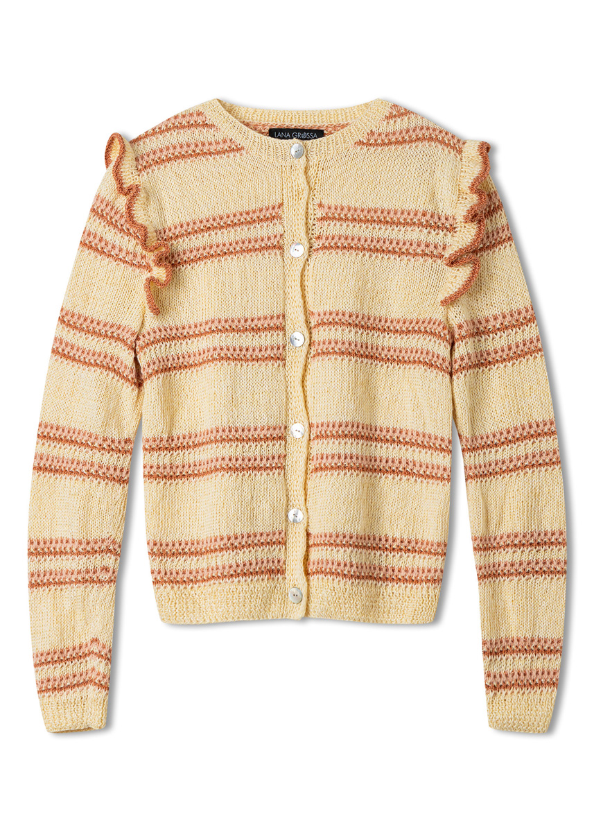 Lana Grossa Tencellino (51% lin, 49% Tencel, løpelengde = ca. 125 m/50 g), 450 (500 - 550 - 600) g i vanilje (farge 6). Lana Grossa Filo Paillettes (55% bomull, 39% polyester, 6% polyamid, løpelengde = ca. 155 m/50 g), 100 (100 - 150 - 150) g i oransje (farge 5). Lana Grossa Ecopuno (72% bomull, 17% ren ny ull (merino), 11% alpakka (baby), løpelengde = ca. 215 m/50 g), 50 g i aprikos (farge 99). strikkepinner nr. 3 og nr. 4. 6 perlemor-knapper, artikel 37604 i perlemor (farge 12 611), 18 mm Ø fra Union Knop