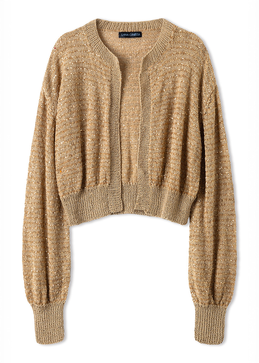 Garn: Lana Grossa «Filo Lurex» (94 % bomull, 6 % polyester, LL = ca. 145 m/50 g): Ca. 300 (300 - 350 - 350) g kamel (frg 17); Lana Grossa «Glamour» (55 % polyamid, 45 % polyester, LL = ca. 115 m/25 g): Ca. 125 (125 - 150 - 150) g kamel (frg 11). Pinner: Nr. 3 og 3,5
