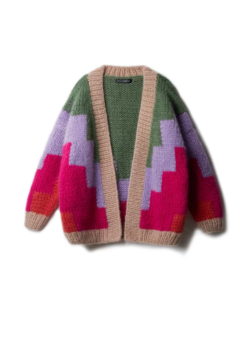 Lana Grossa Mohair di Gio ca. 200 (200 - 250) g i pink (farge 3), je ca. 100 (150 - 150) g i beige (farge 8), syrinlilla (farge 1) og i resedagrønn (farge 13) og ca. 100 g i oransjerød (farge 6).