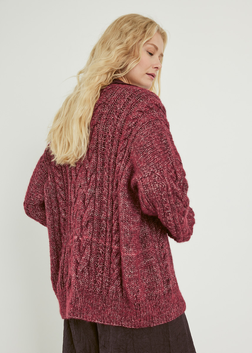 Garn: Lana Grossa Natural Alpaca Pelo (63 % bomull, 31 % alpakka (baby), 6 % ren ny ull (merino), LL= 125 m / 50 g): 500 (550 / 600 / 650) g burgunder melert (frg 30). Pinner: Rundpinne 4 og 6 mm, 80–100 cm lang (strikk omg med liten omkrets enten med teknikken magic loop en eller en ekstra kort rundpinne på 4 mm), flettepinne.