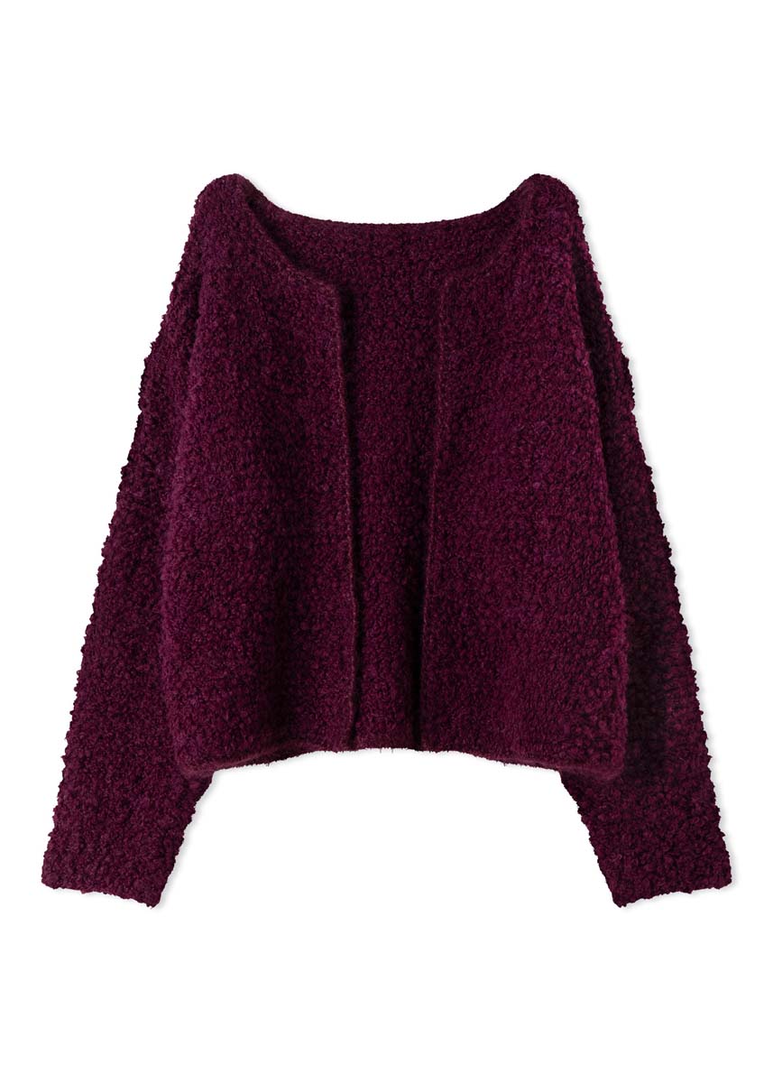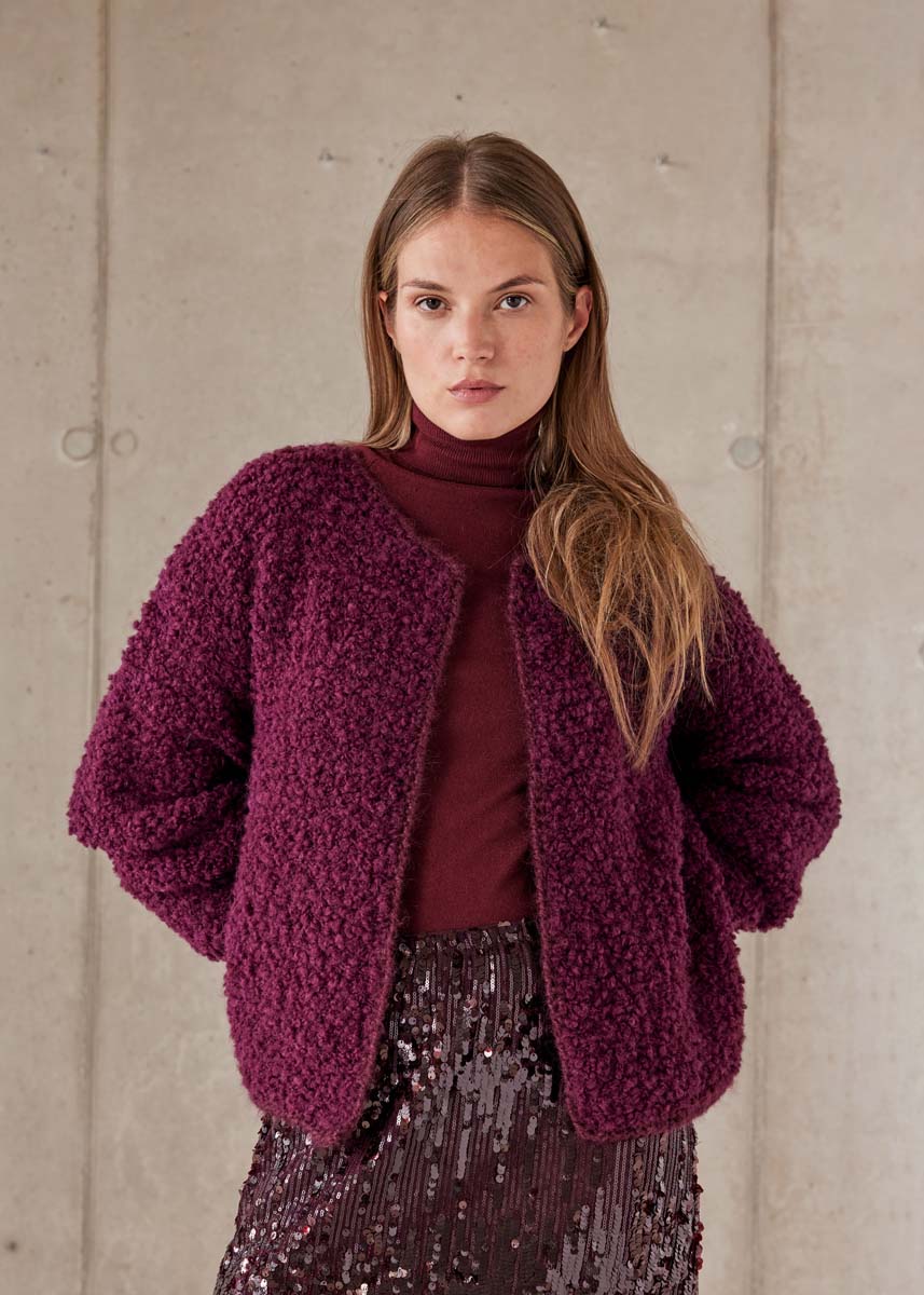 Lana Grossa Orsetto (60% ny ull (merino), 40% alpakka (superfin), løpelengde 75 m/50 g), 400 (450 - 500) g i burgunder (farge 5) og Lana Grossa Silkhair (70% mohair (superkid), 30% silke, løpelengde 210 m/25 g), 25 g i mørkrød (farge 177); strikkepinner nr. 7; 1 heklenål nr. 6.