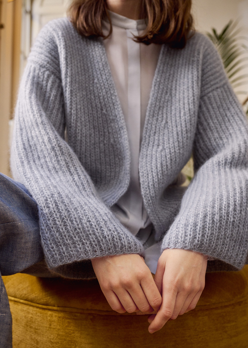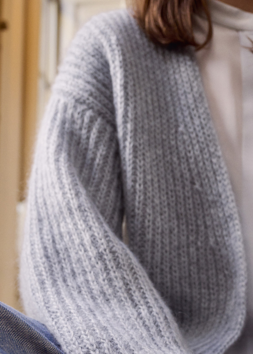 Garn: Lana Grossa «Superkid Seta» (65 % mohair (superkid), 35 % silke, LL = ca. 100 m/25 g): Ca. 325 (350 - 375 - 400) g lys grå (frg 2).