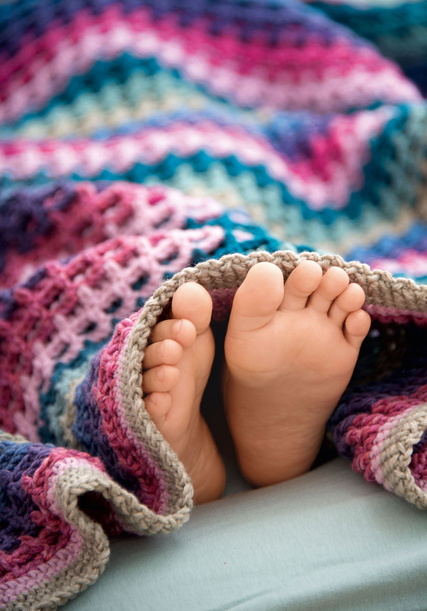 Zeigt her eure Füßchen… damit sie schön warm bleiben stecken wir sie in niedliche Babyschuhe, die mal gestrickt, mal gehäkelt werden. Apropos: diese farbenfrohe Häkeldecke ist ein Mix aus Stäbchen und Reliefstäbchen, mit einem Rand aus festen Maschen und einem dekorativen Abschluss in Kettmaschen-Bögen. Ein echtes Prachtstück!