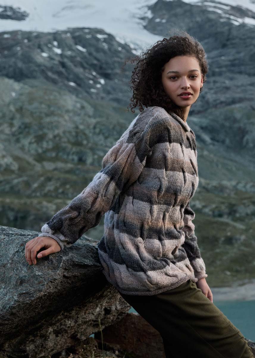Lana Grossa-kvalitet „Gomitolo Fumo“ (50 % ren ny ull, 50 % polyacryl, løpelengde = ca 700 m/200 g): 2 (3) nøster = ca 400 (600) g mykgrå/lysegrå/mellomgrå/mørkgrå/grège/anthrasitt (farge 518); strikkepinner nr. 4,5 og 5; 1 kort rundpinne nr. 4,5; 1 flettepinne.