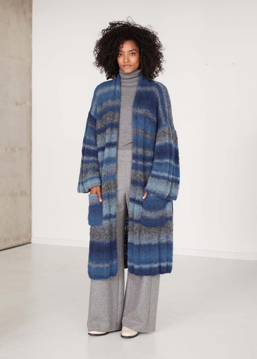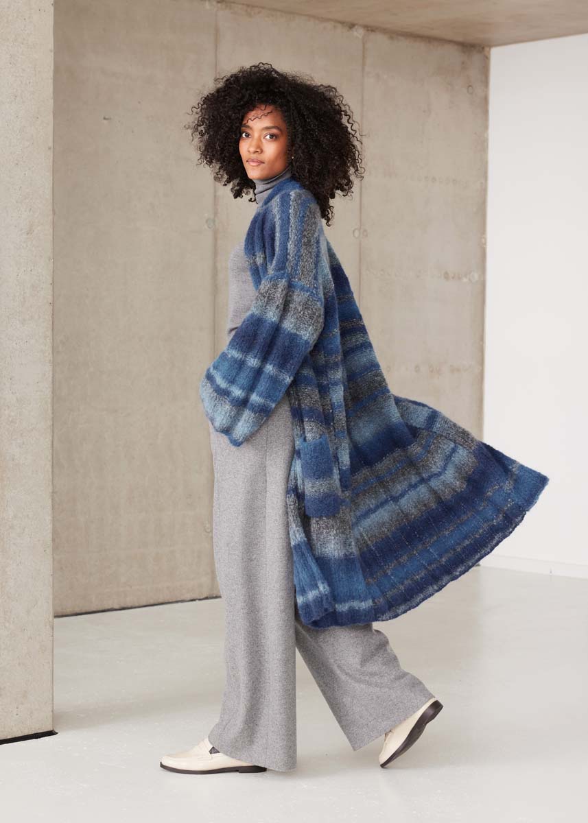 Lana Grossa Gigante (70% alpakka (fein), 30% polyamid, løpelengde = ca. 300 m/100 g), 500 (600) g i mørk-/nattblå/gråblå/grå (farge 7); strikkepinne nr. 7; 2 hjelpepinne til hvilende m.