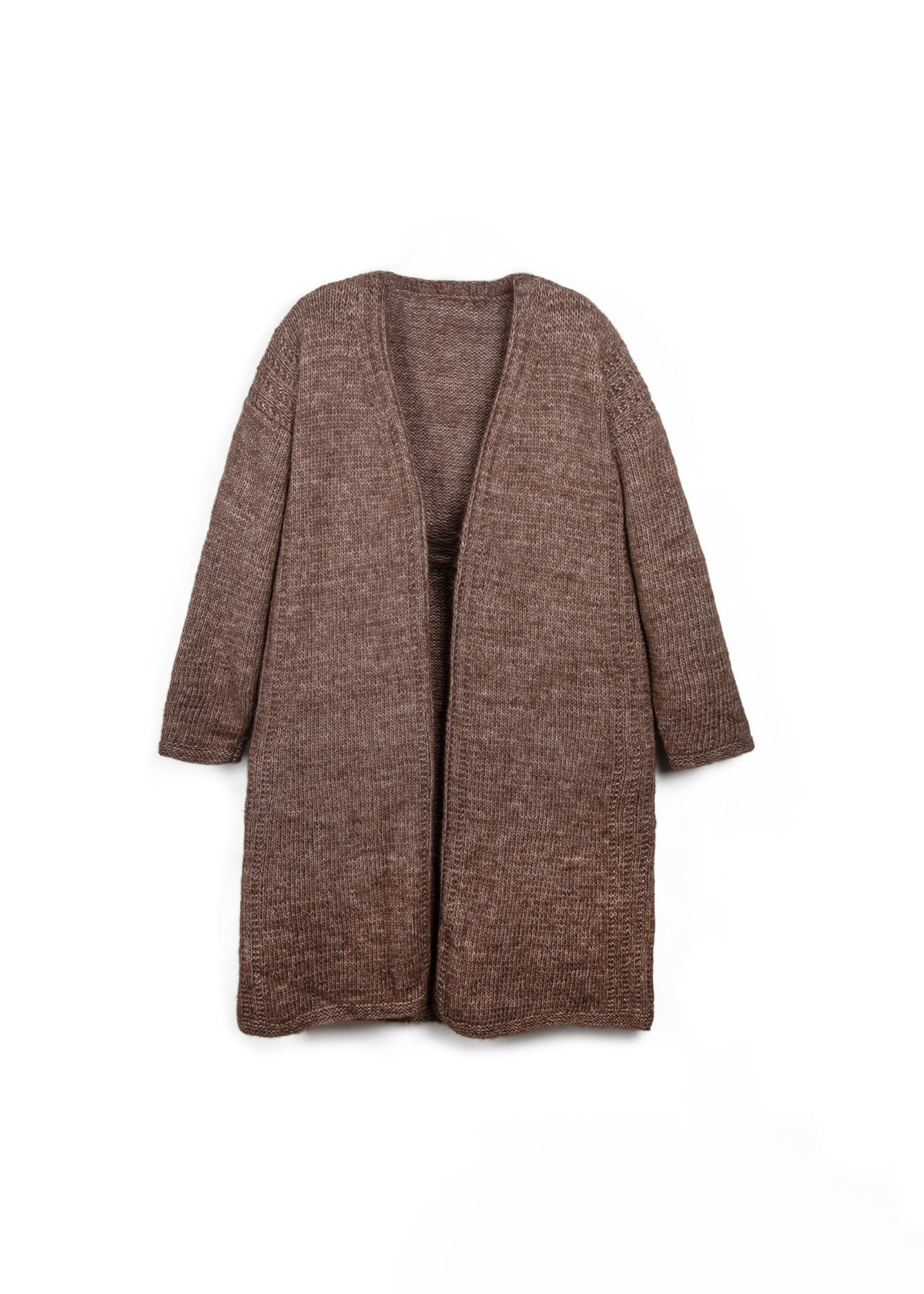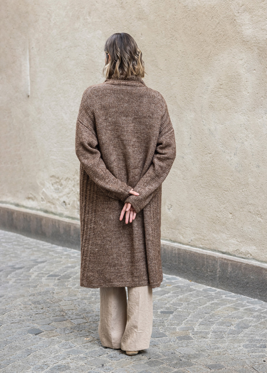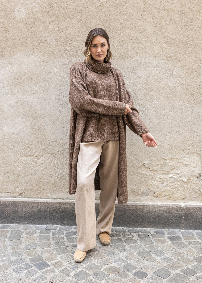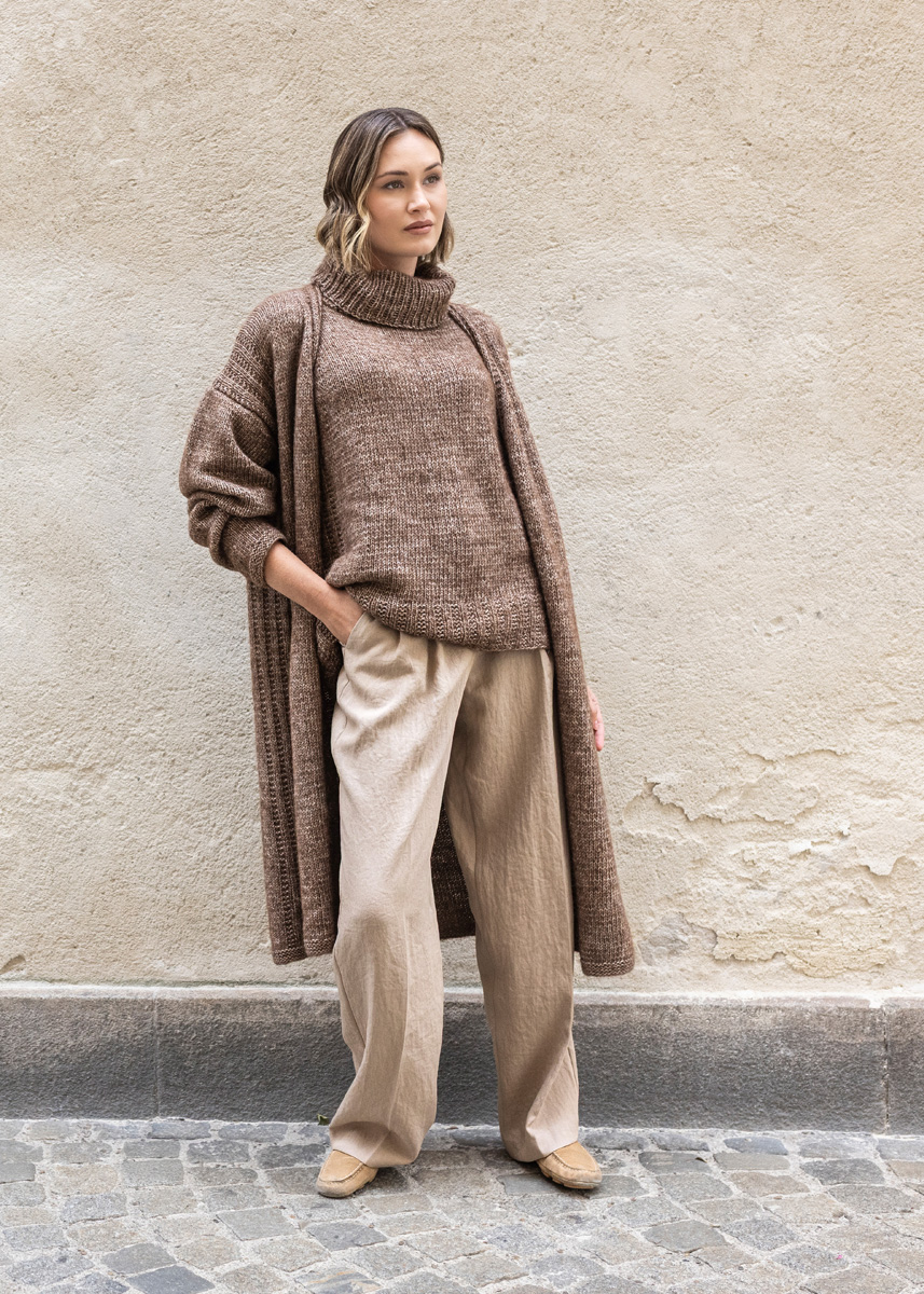 Lana Grossa NATURAL ALPACA PELO 63 % bomull, 31 % alpakka, 6 % ren ny ull merino Løpelengde: ca. 125 m / 50 g • 500 (550 - 600 - 650 - 700 - 700) g mørkbrun melert (farge 8) eller råhvit/mykgrå (farge 2) • Strikkepinner nr. 5 og 5,5