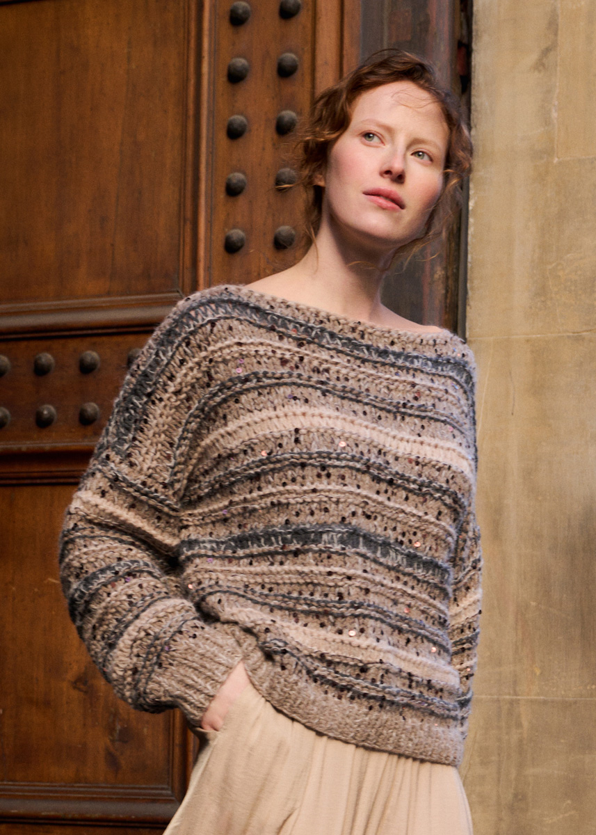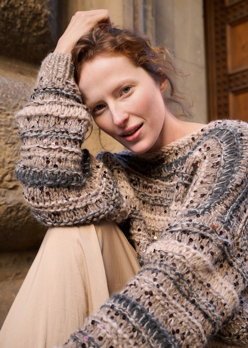 Garn: Lana Grossa «Alta Moda Cashmere 16» (78 % ren ull (merino), 12 % kashmir, 10 % polyamid, LL = ca. 110 m/50 g): Ca. 250 (300 - 300 - 350) g taupe (frg 3), ca. 100 (100 - 150 - 150) g beige (frg 76) og ca. 100 (100 - 150 - 150) g nattgrå (frg 13), Lana Grossa «Setasuri» (69 % alpakka (suri), 31 % silke, LL = ca. 212 m/25 g): Ca. 100 (100 - 125 - 125) g krem (frg 2), Lana Grossa «Cosmo» (100 % bomull (pluss paljetter), LL = ca. 260 m/100 g): 100 (100 - 200 - 200) g mokka (frg 6).