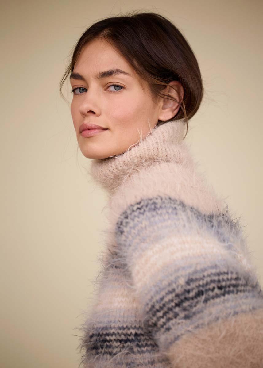 Lana Grossa «Basta» (50% ren ny ull (merino), 50% polyamid, LL = ca. 100 m/50 g): 400 (450 - 500 - 550) g beige (frg 3) og Lana Grossa «Basta Mista» (50% ren ny ull (merino), 50% polyamid, LL = ca. 100 m/50 g): 100 (100 - 100 - 150) g hvit/lys-/mellom-/mørk-grå/koksgrå (frg 109) Pinner: Kort og lang rundpinne nr. 5 og 6, strømpepinner nr. 5