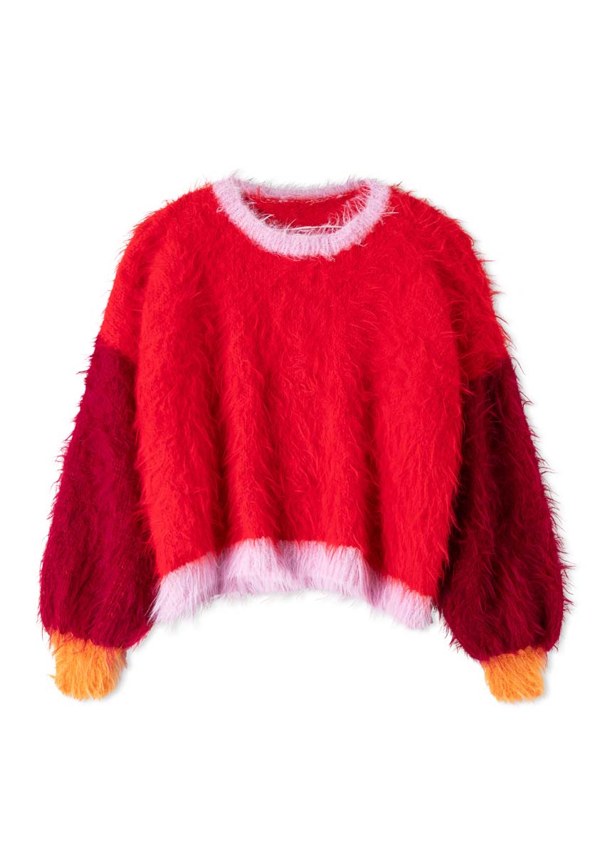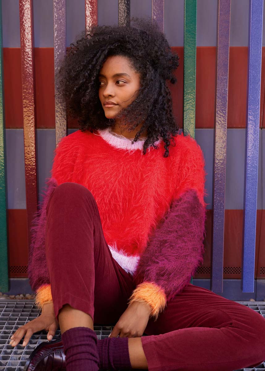 Lana Grossa Basta (50% ny ull (merino), 50% polyamid, løpelengde = ca. 100 m/50 g), 250 (300 - 300 - 350) g refleksrød (farge 27), 150 (150 - 200 -200) g rød (farge 09), 50 g mandarin (farge 28) og 50 g fiolettrosa (farge 18). strikkepinne nr. 5 og nr. 6; en 50 cm lang rundpinne nr. 5.