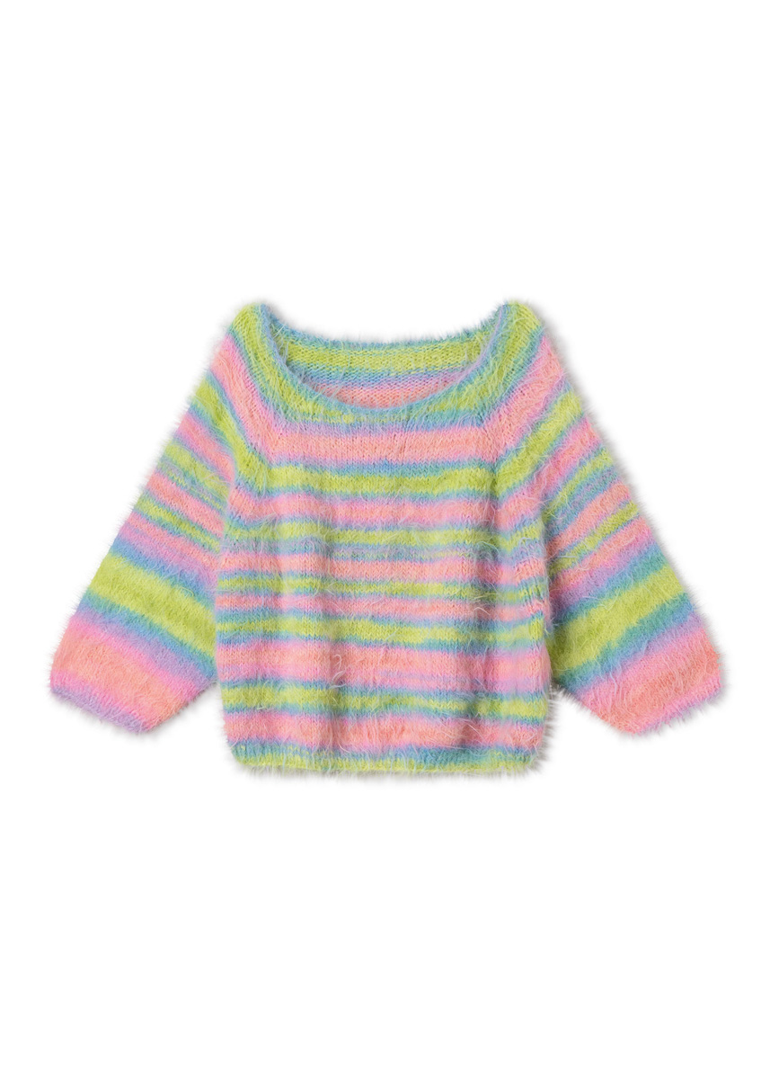 Lana Grossa-kvalitet „Basta Mista“ (50 % ren ny ull (merino), 50 % polyamid, løpelengde = ca 100 m/50 g): 400 (400 - 450 - 500) g limette/tyrkis/aqua/laks/rosa/syrin (farge 113); kort og lange rundpinne nr. 5 og nr. 6; maskemarkører.