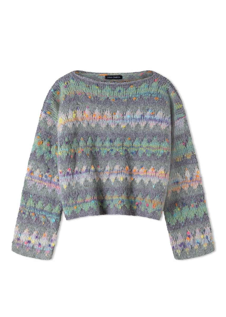 Lana Grossa Brigitte No. 2 (47% alpakka (baby), 45% bomull, 8% ny ull (merino), løpelengde 140 m/50 g), 100 (150 - 150 - 200) g hver i grågrønn (farge 18) og lys grå (farge 70) og Lana Grossa Cassata (54% ny ull (merino ekstrafin), 30% polyamid, 16% bomull, løpelengde 175 m/50 g), 100 (100 - 150 - 150) g hver i natur/gul/oransje/laks/rosa/myklilla/tyrkis (farge 6) og mykgrønn/lysoransje/rosa/lysgrå/lilla (farge 11); strikkepinner nr. 6,5.