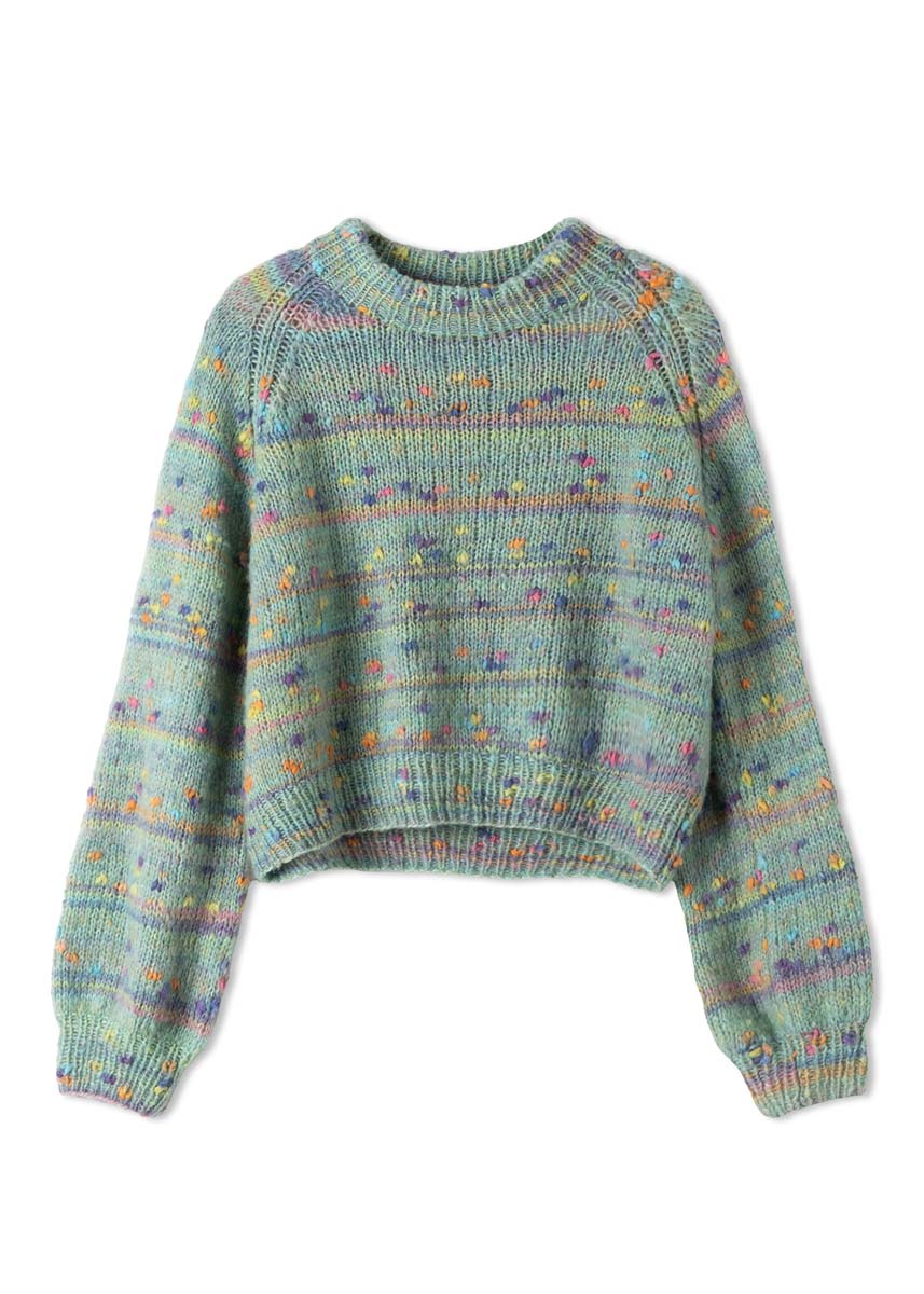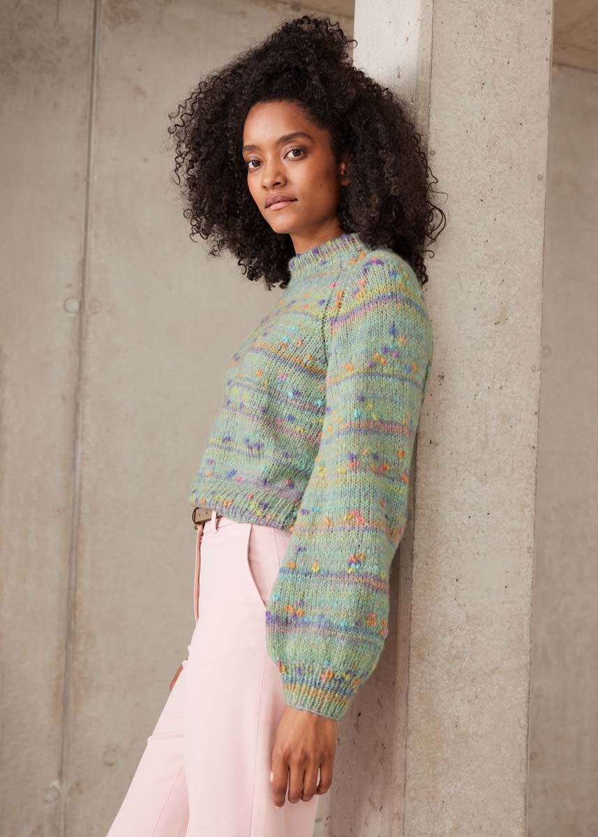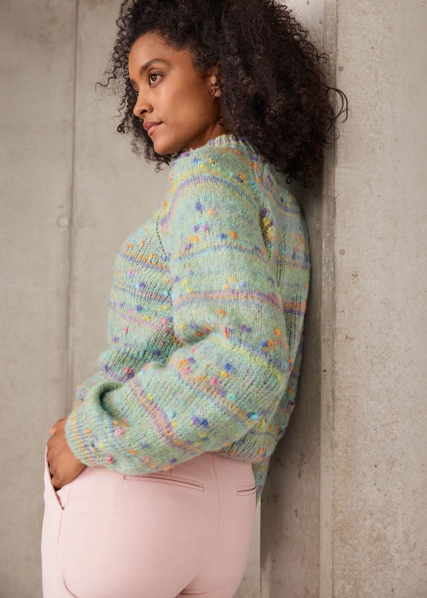 Lana Grossa Cassata (54% ny ull (merino ekstrafin), 30% polyamid, 16% bomull, løpelengde = ca. 175 m/50 g), 250 (250 - 300) g i mykgrønn/lysoransje/rosa/lysgrå/lilla (farge 11); strikkepinne nr. 3 og nr. 5 og en 50 cm lang rundpinne nr. 3.