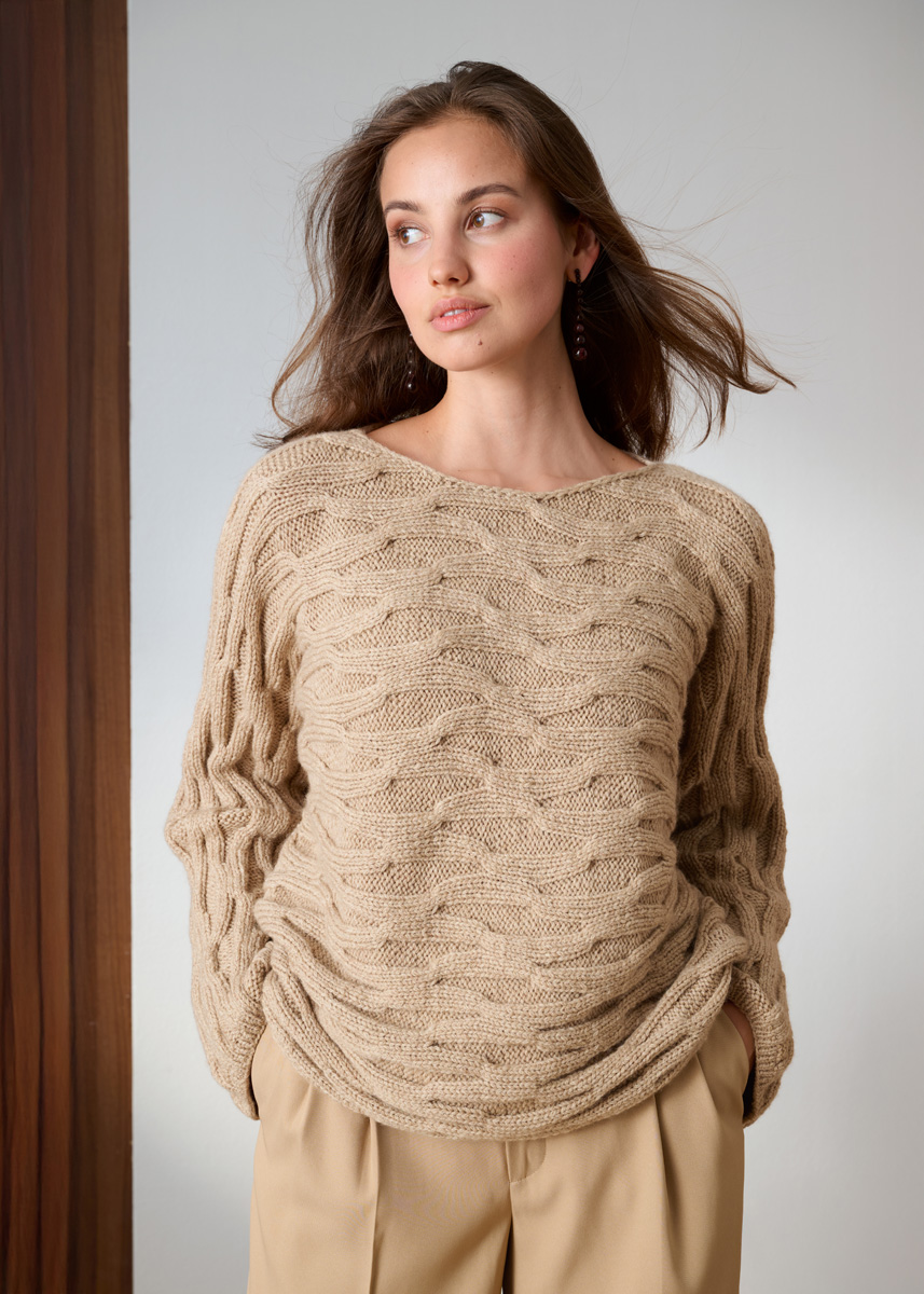 Lana Grossa Cool Merino (90% ren ny ull (merino ), 10% polyamid, løpelengde 150 m/50 g), 550 (600 – 650) g beige (farge 40); strikkepinner nr. 4 og 6, såvel som 1 flettepinne.