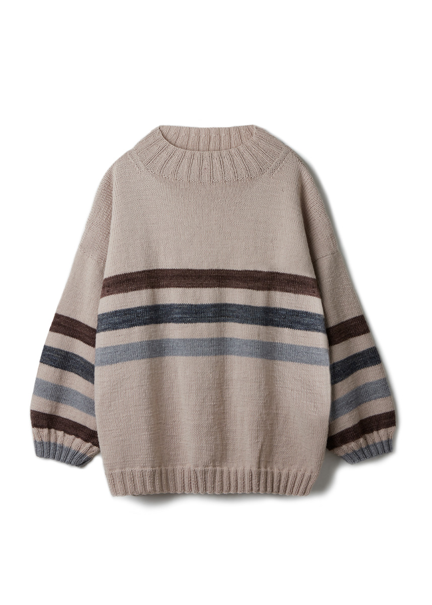 Lana Grossa Cool Wool (100% ren ny ull (merino extrafine), LL = ca. 160 m/50 g), 450 (500 – 550 – 600) g perlebeige (frg 2114). Cool Wool Vintage (100% ren ny ull (merino extrafine), LL = ca. 160 m/50 g), 50 g lys grå (frg 7369), mørk brun (frg 7384) og mørk grå (frg 7391) Pinner: Rundpinne (50 og 80 cm) nr. 3, rundpinne (80 cm) nr. 3,5, tre hjelpepinner for å legge m til side
