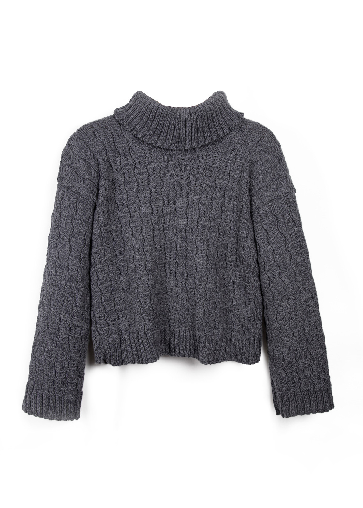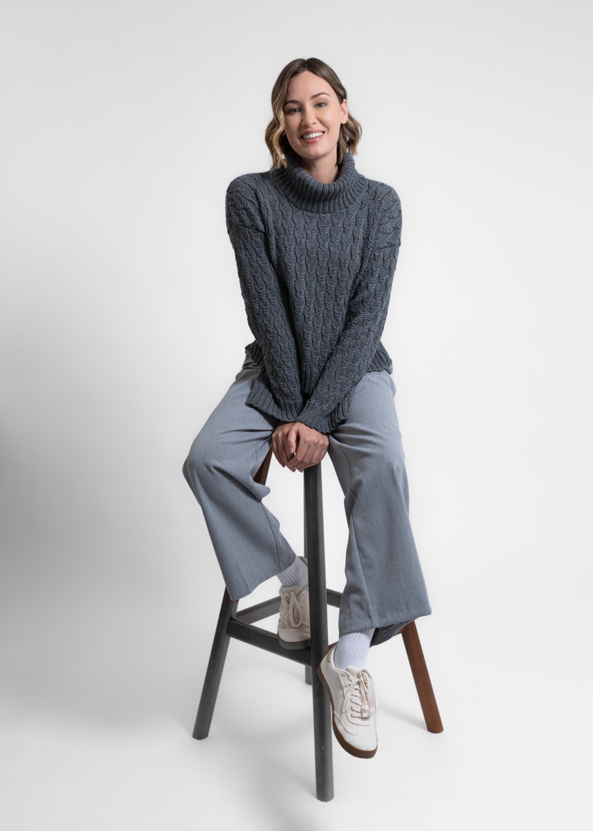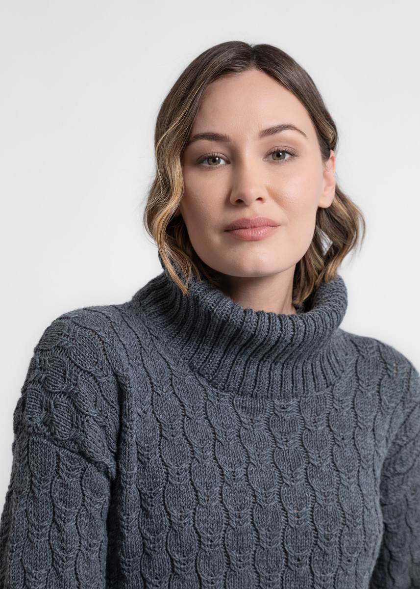 Lana Grossa COOL WOOL 100 % ren ny ull merino Løpelengde: ca. 160 m / 50 g • 600 (650 - 700 - 750 - 800 - 850) g mørkgrå melert (farge 412) • Strikkepinner nr. 3,5 • Rundpinne nr. 3,5 / 40 cm • Flettepinne