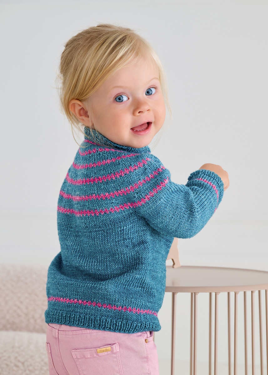 Lana Grossa Cool Wool Vintage (100% ren ny ull (merino extrafine); løpelengde = 160 m/50 g): 150 g petrol (farge 7379) og 50 g pink (farge 7389); 1 rundpinne 3,5 mm; maskemarkører.