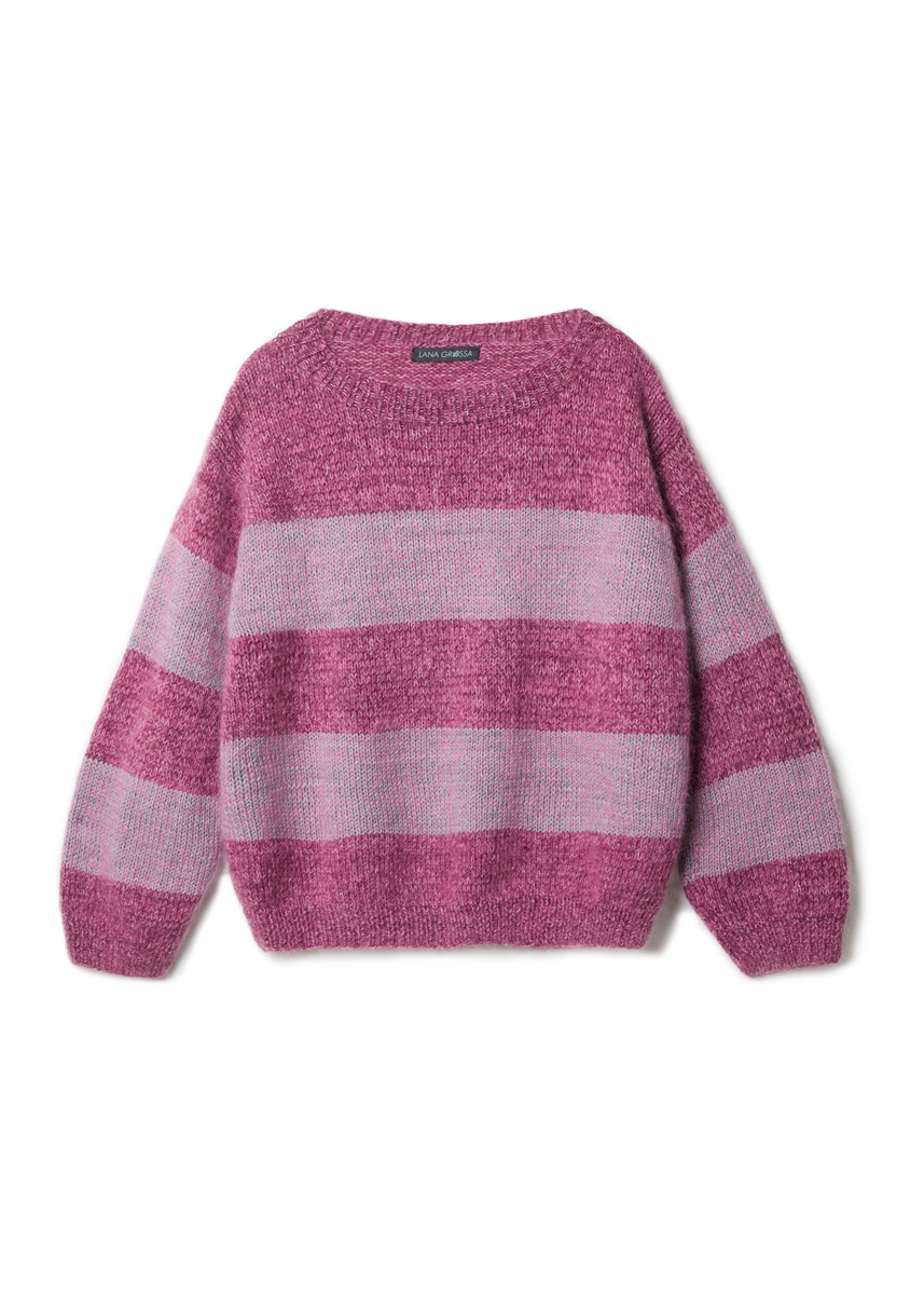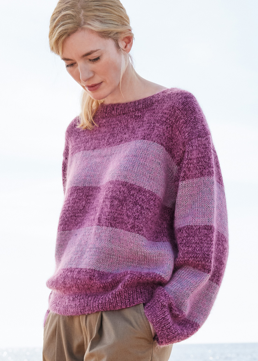 Garn: Lana Grossa Cool Wool Vintage (100 % ren ny ull (merino extrafine), LL = ca. 160 m/50 g), 150 (200 – 200 – 250) g lys grå (frg 7369) og 250 (250 – 300 – 300) g plomme (frg 7365). Lana Grossa Silkhair (70% mohair (superkid), 30% silke, LL = ca. 210 m/25 g), 150 (150 – 175 – 200) g rosa (frg 162) Pinner: Nr. 4,5 og 5, rundpinne (50 cm) nr. 4,5 Info: Strikk genseren med en tråd Cool Wool Vintage sammen med en tråd Silkhair.