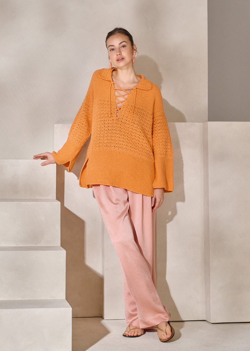 Lana Grossa-Kvalitet Cotonella (100% bomuld (pima), løbelængde 280 m/100 g), 600 (600 – 700) g mandarin (farve 203); strikkepinde nr. 4½, samt hæklenål nr. 4, 4½ og 5.
