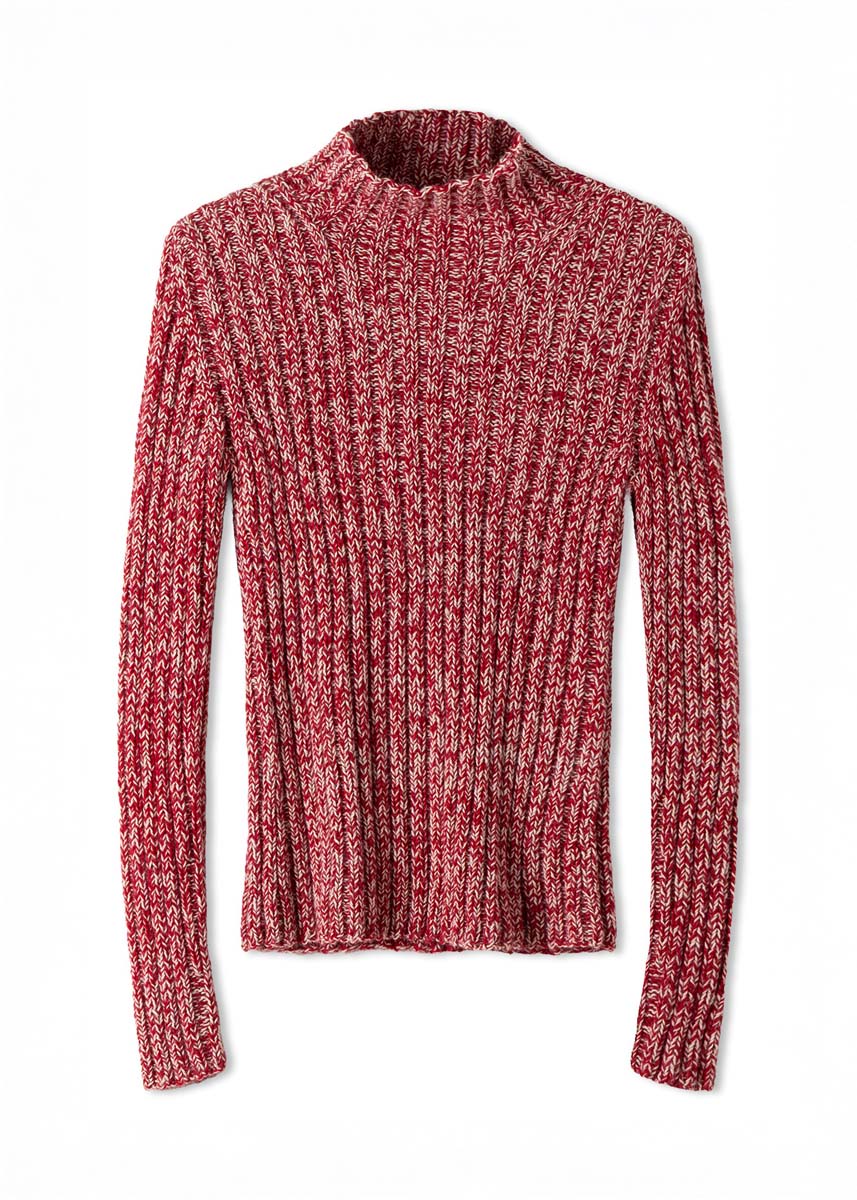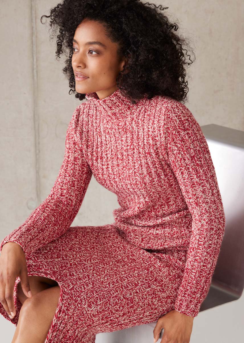 Lana Grossa Ecopuno (72% bomull, 17% ny ull (merino), 11% (baby) alpakka, løpelengde = ca. 215 m/50 g), 300 (350 - 400) g i perlebeige (farge 66) og 300 (350 - 400) g i kirsebærrød (farge 47); strikkepinne og 5 settpinner nr. 4; 2 hjelpepinner.