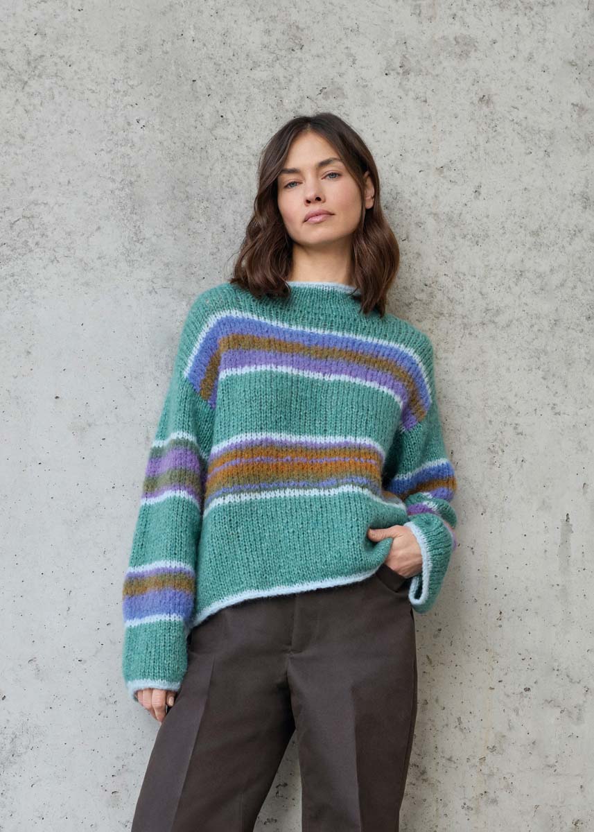 Lana Grossa-kvalitet „Alpaca Air II“ (50 % alpakka (baby), 27 % polyamid, 14 % bomull, 9 % ren ny ull (merino ), løpelengde = ca 140 m/50 g): 50 (50 - 100 - 100) g pastellblå (farge 28), 150 (200 - 250 - 300) g lys sjøgrønn (farge 23), Lana Grossa-kvalitet „Gigante“ (70 % alpakka (fin), 30 % polyamid, løpelengde = ca 300 m/100 g): ca 100 (100 - 200 - 200) g fiolett/fiolblå/mosegrønn/khaki/oker (farge 14); kort og lang rundpinne nr. 7.
