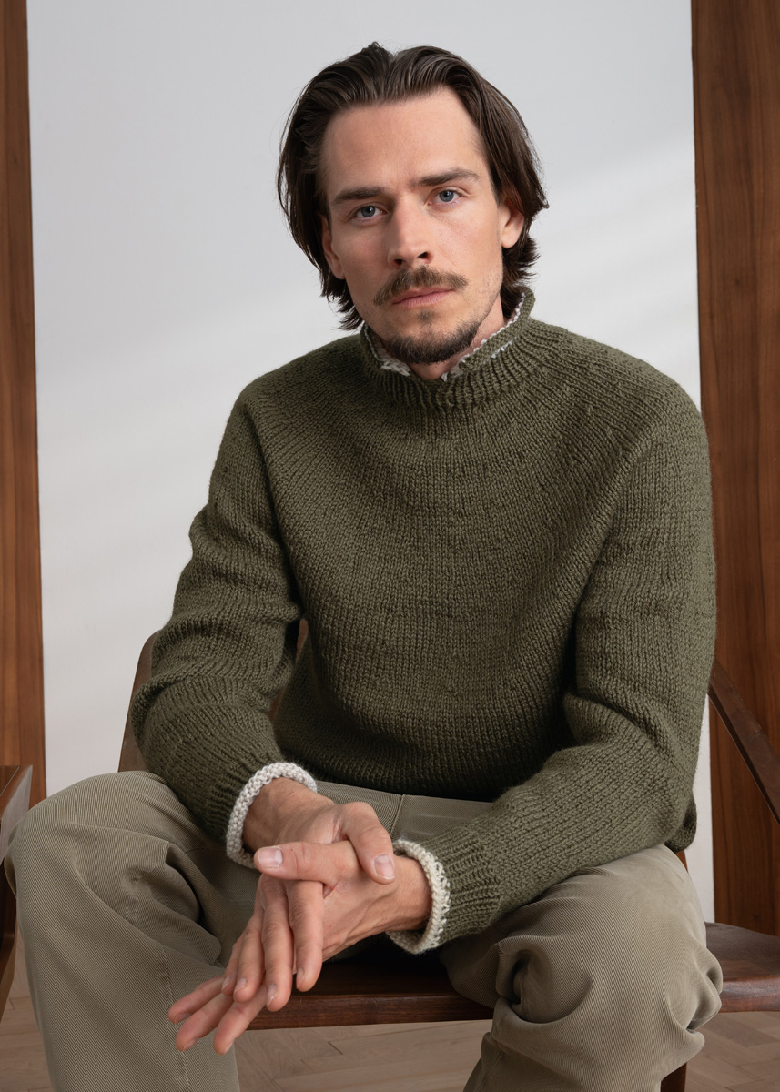 Lana Grossa Landlust naturwolle (100% (Norwegische) ren ny ull, løpelengde 85 m/50 g), 650 (700 – 750) g olivengrønn (farge 3) og 50 g grège (farge 18); rundpinner nr. 5, 40, 60 og 80 cm lang. TIPS: strikkes rundt i ett stykke, nedenfra og opp. Pilene i mønsteret indikerer strikkeretningen.