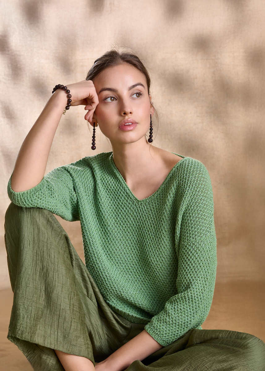 Lana Grossa-Kvalitet Landlust Sommerseide (50% silke, 50% bomuld, løbelængde 170 m/50 g), 350 (400 – 450) g æblegrøn (farve 36); strikkepinde nr. 3 og 4½ samt 1 hæklenål nr. 3½.