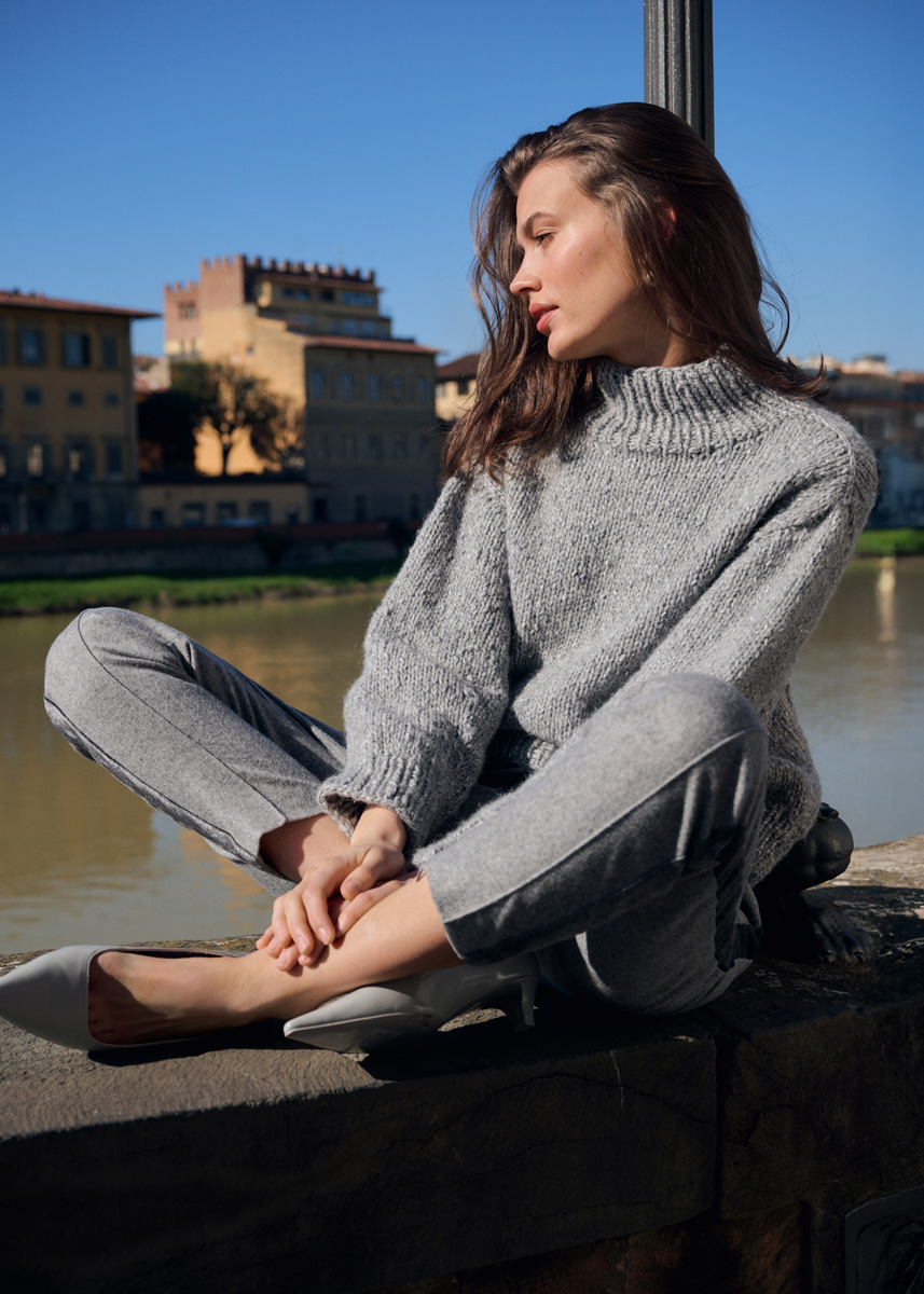 Lana Grossa «Lucciola» (29 % polyamid, 24 % ren ull (merino fine), 22 % viskose, 20 % alpakka (baby), 5 % metallfibre, LL = ca. 130 m/50 g): Ca. 550 (600 - 650 - 700) g grå (frg 2).