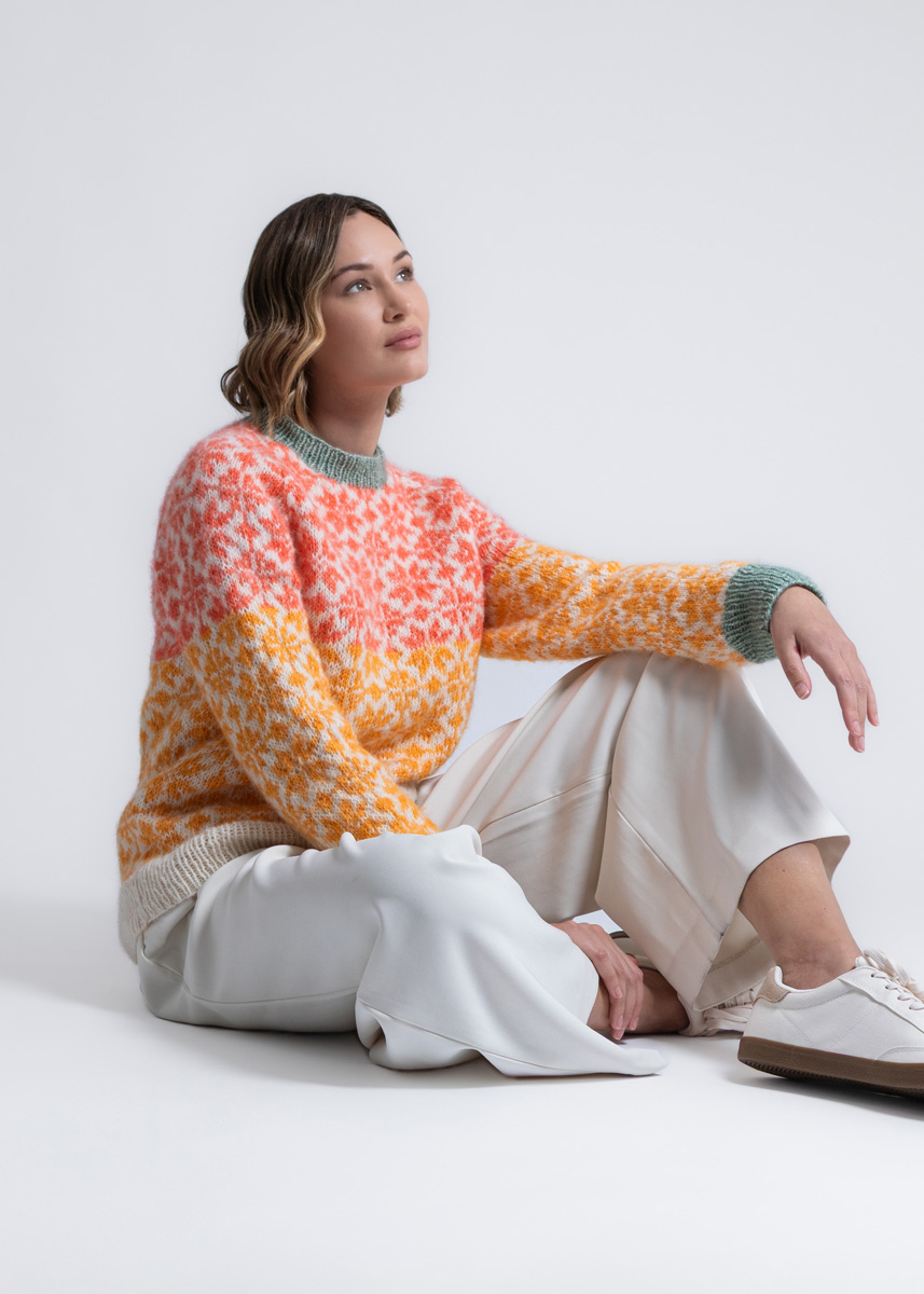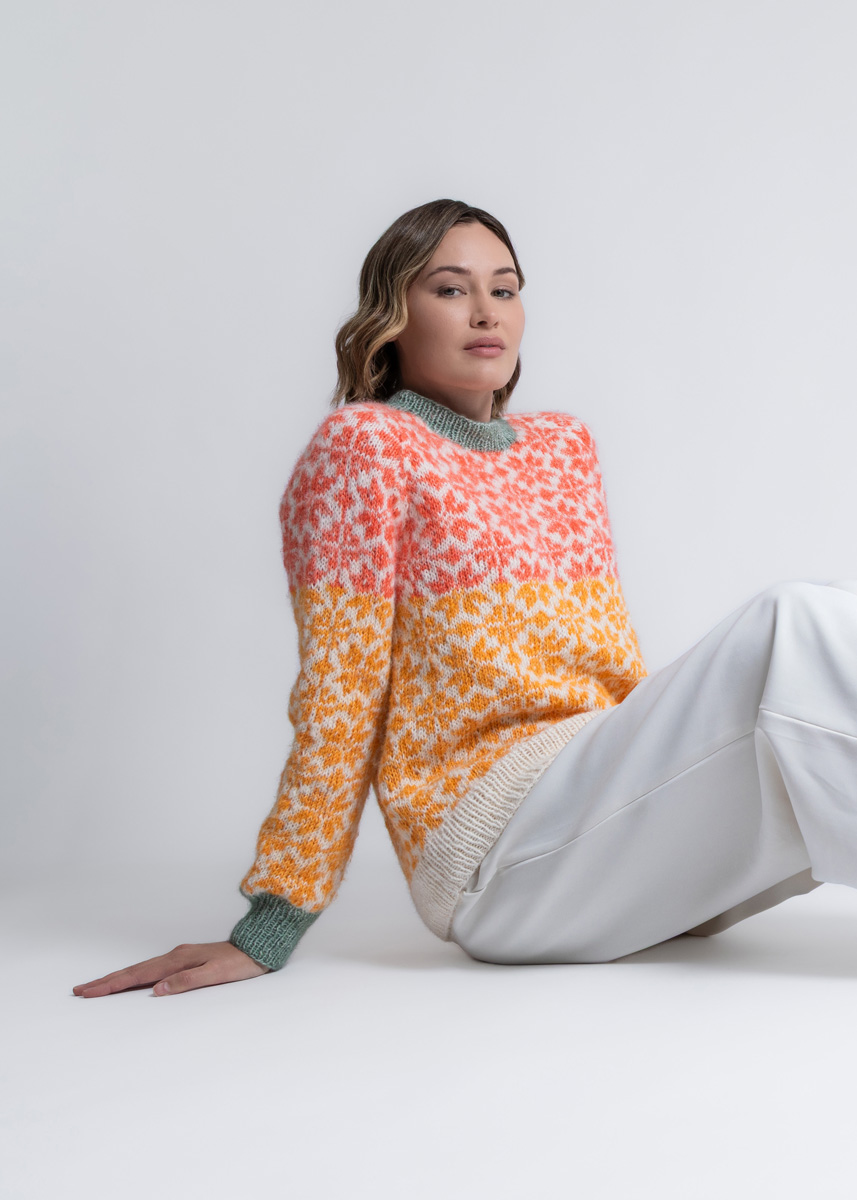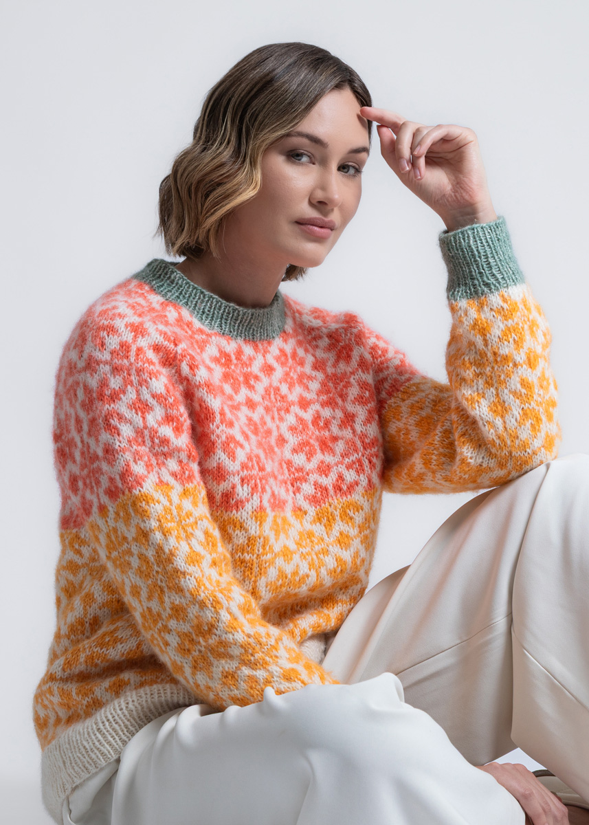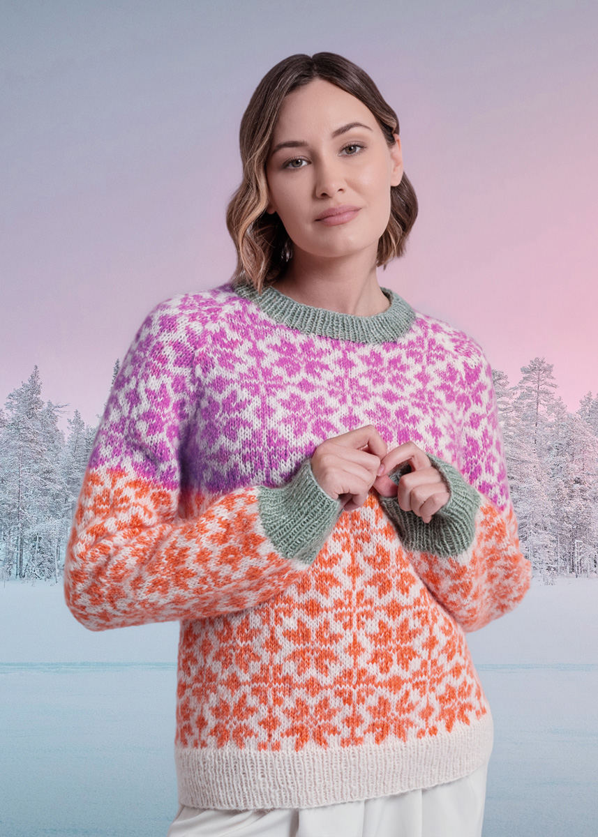 Rygg- og forstykke strikkes rundt fram til ermehullene, og deretter avsluttes de separat. Ermene strikkes også rundt fram til raglanskråningen. Modellen har en total lengde på 61 (63 - 65 - 67 - 69 - 71) cm og har en brystvidde som er 15 cm større enn en brystomkrets på 80 cm (16 cm større enn en brystomkrets på 88 cm - 8 cm større enn en brystomkrets på 96 cm - 10 cm større enn en brystomkrets på 104 cm - 7 cm større enn en brystomkrets på 116 cm - 5 cm større enn en brystomkrets på 128 cm).
