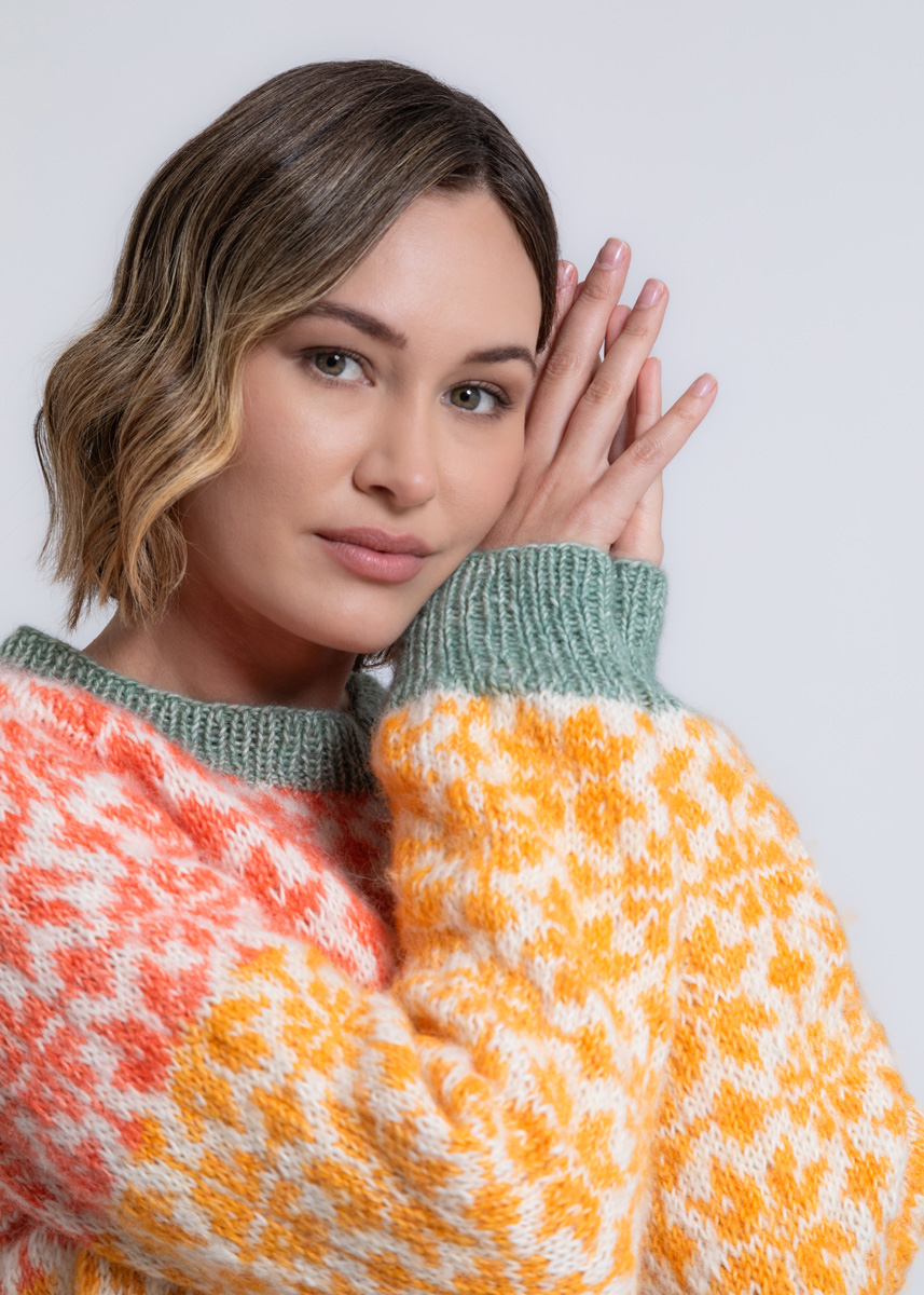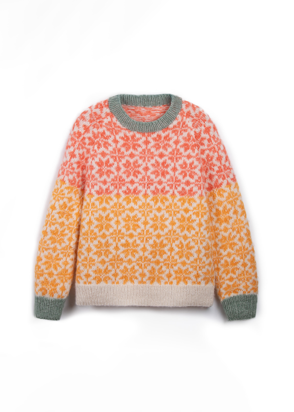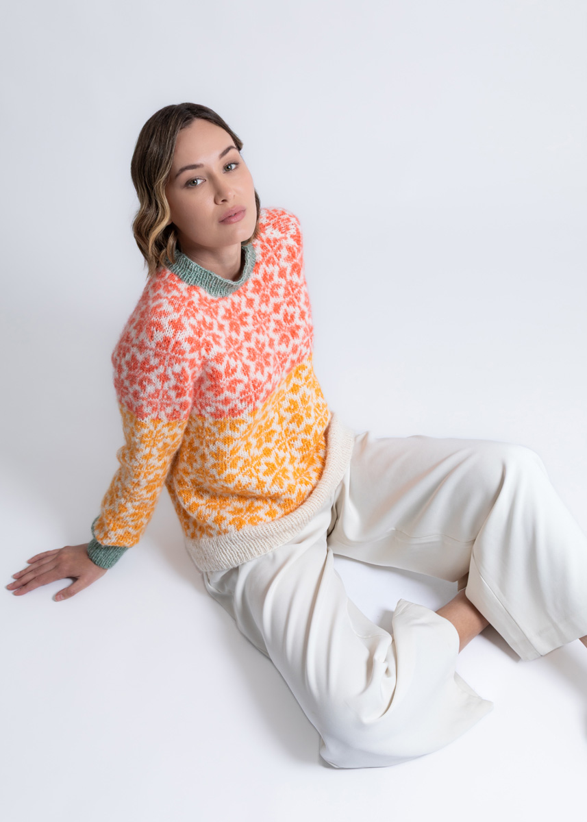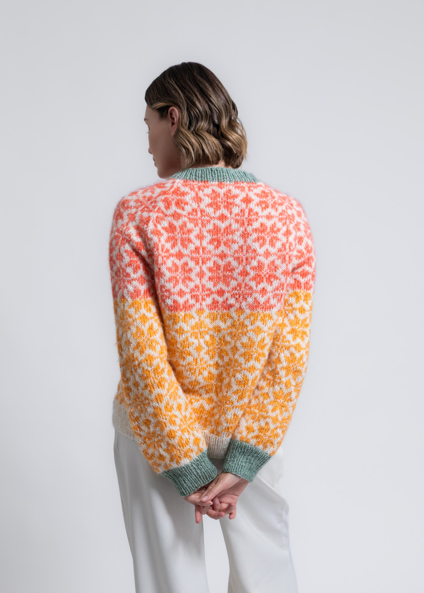 Rygg- og forstykke strikkes rundt fram til ermehullene, og deretter avsluttes de separat. Ermene strikkes også rundt fram til raglanskråningen. Modellen har en total lengde på 61 (63 - 65 - 67 - 69 - 71) cm og har en brystvidde som er 15 cm større enn en brystomkrets på 80 cm (16 cm større enn en brystomkrets på 88 cm - 8 cm større enn en brystomkrets på 96 cm - 10 cm større enn en brystomkrets på 104 cm - 7 cm større enn en brystomkrets på 116 cm - 5 cm større enn en brystomkrets på 128 cm).